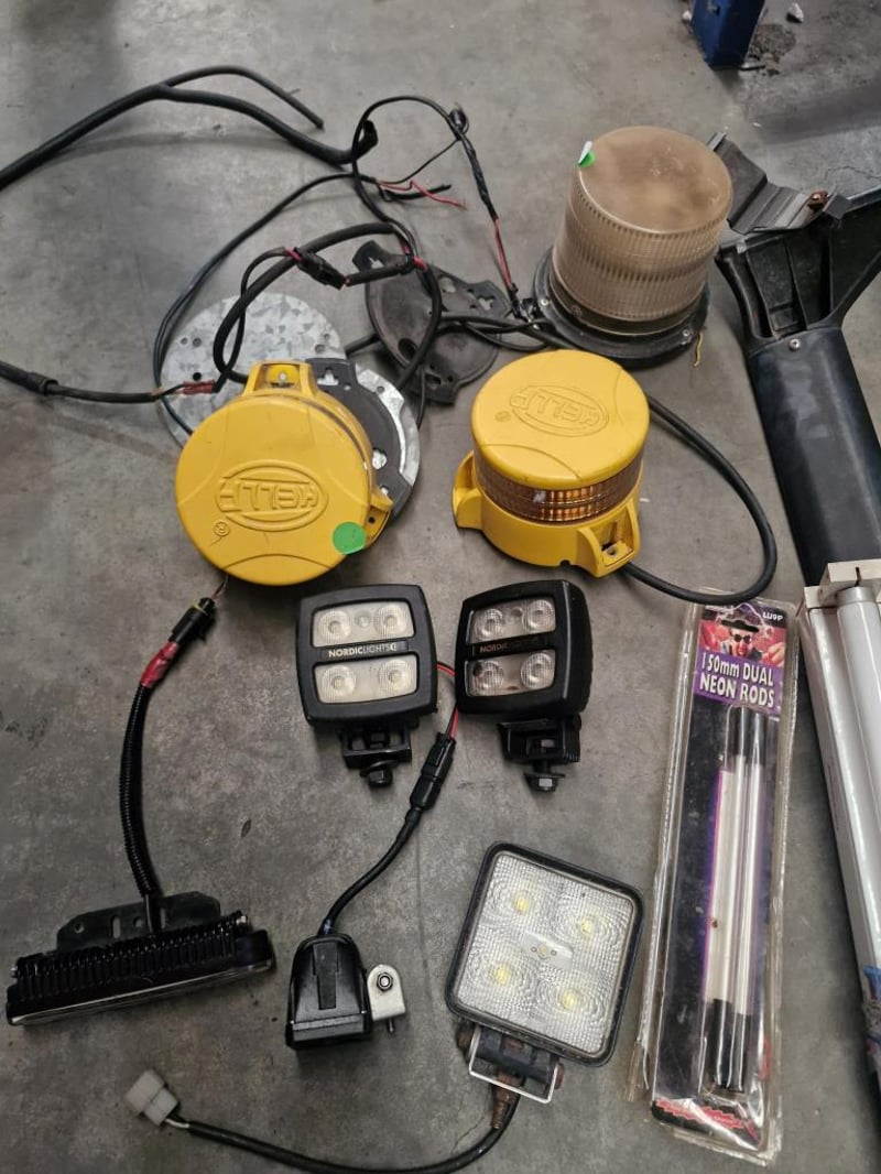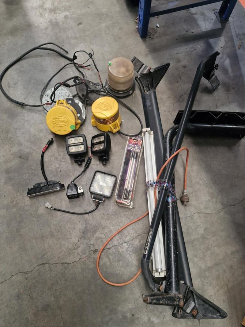 Includes Driving Spot Lights, Roof top Beacons Electric Polisher, Various Lights, Helmet, Assorted brackets Toy/Game