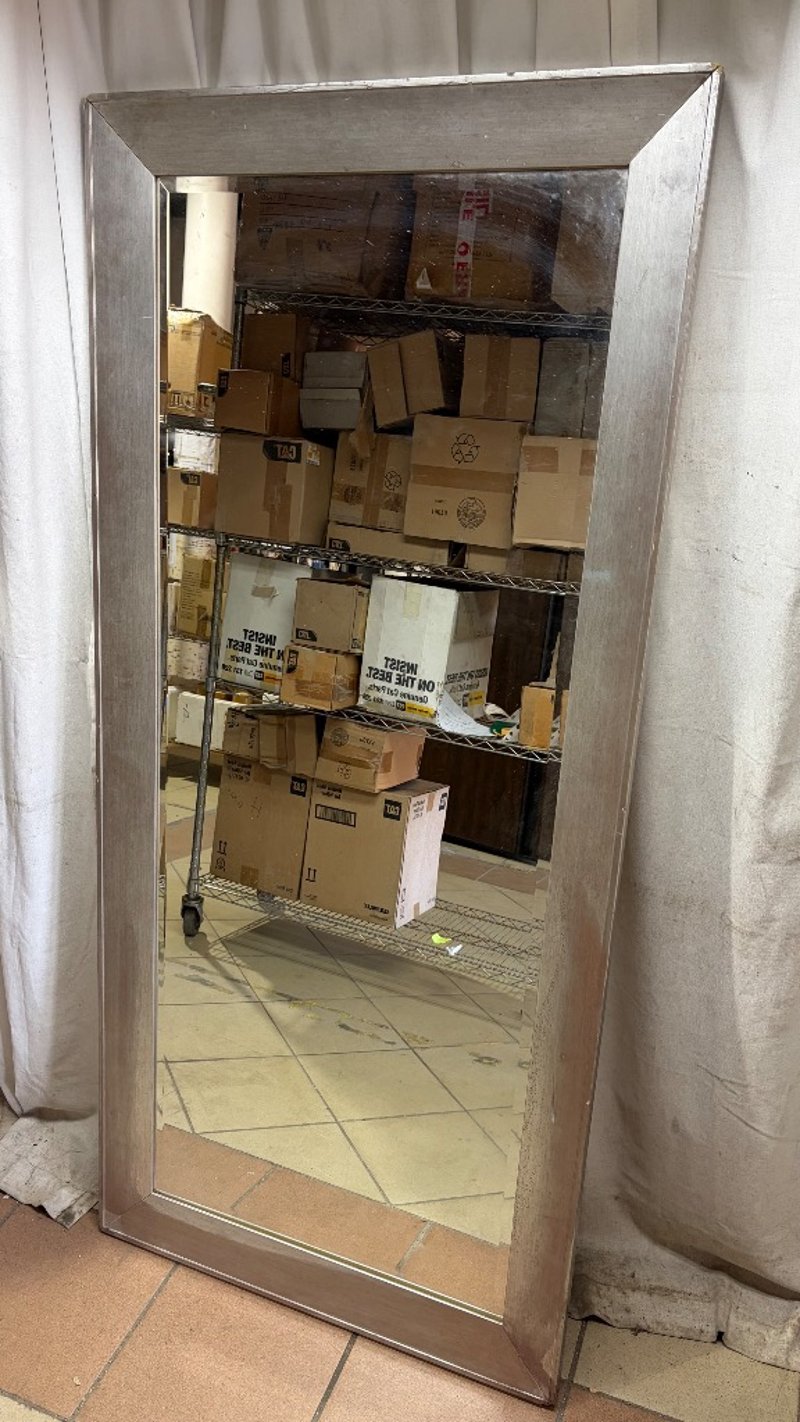 Mirror, grey finish timber. Dimensions: H 169.5cm, W 77.5cm, D 4.5cm.