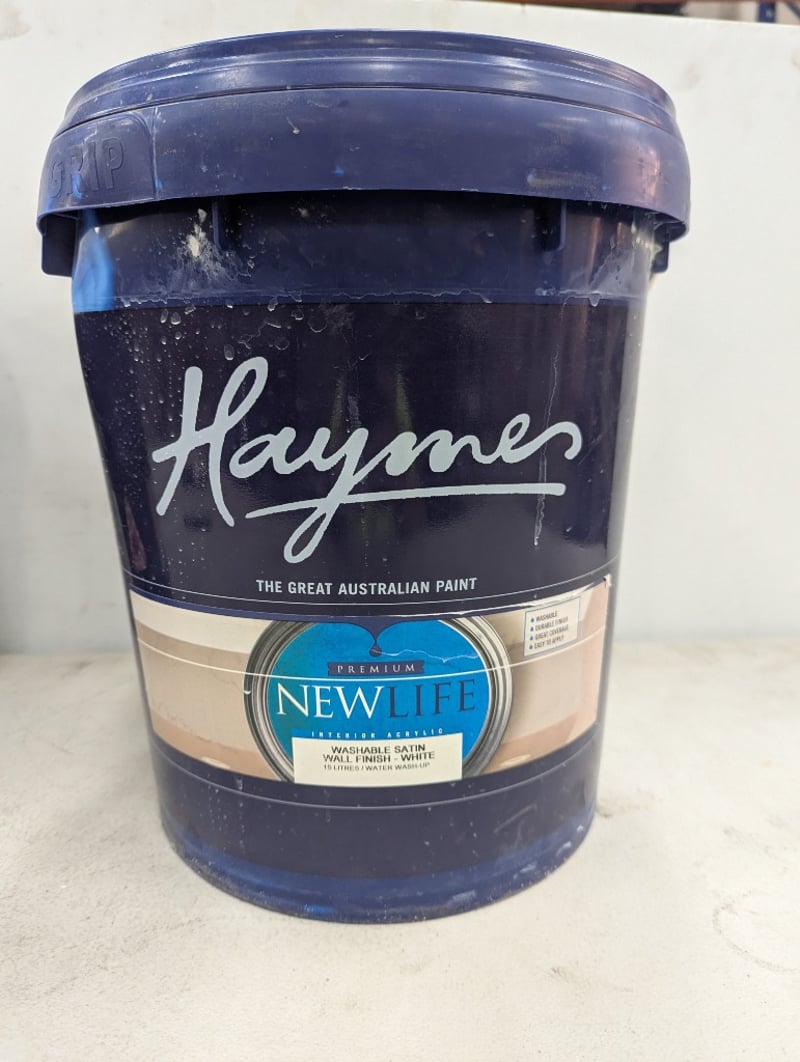 Paint, Haymes, Premium New Life, Washable Satin, Wall Finish, White, 15 litres BID PER LITRE, MUST TAKE 15 LITRES