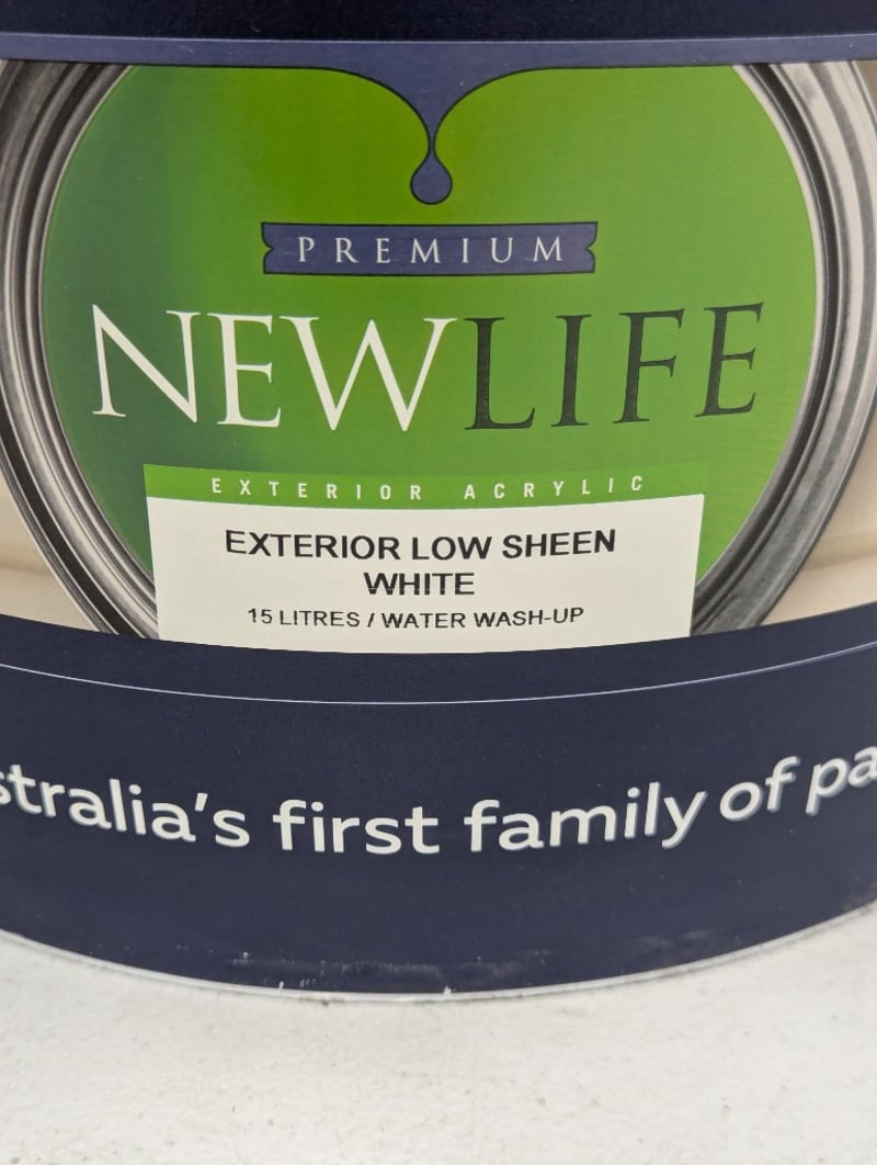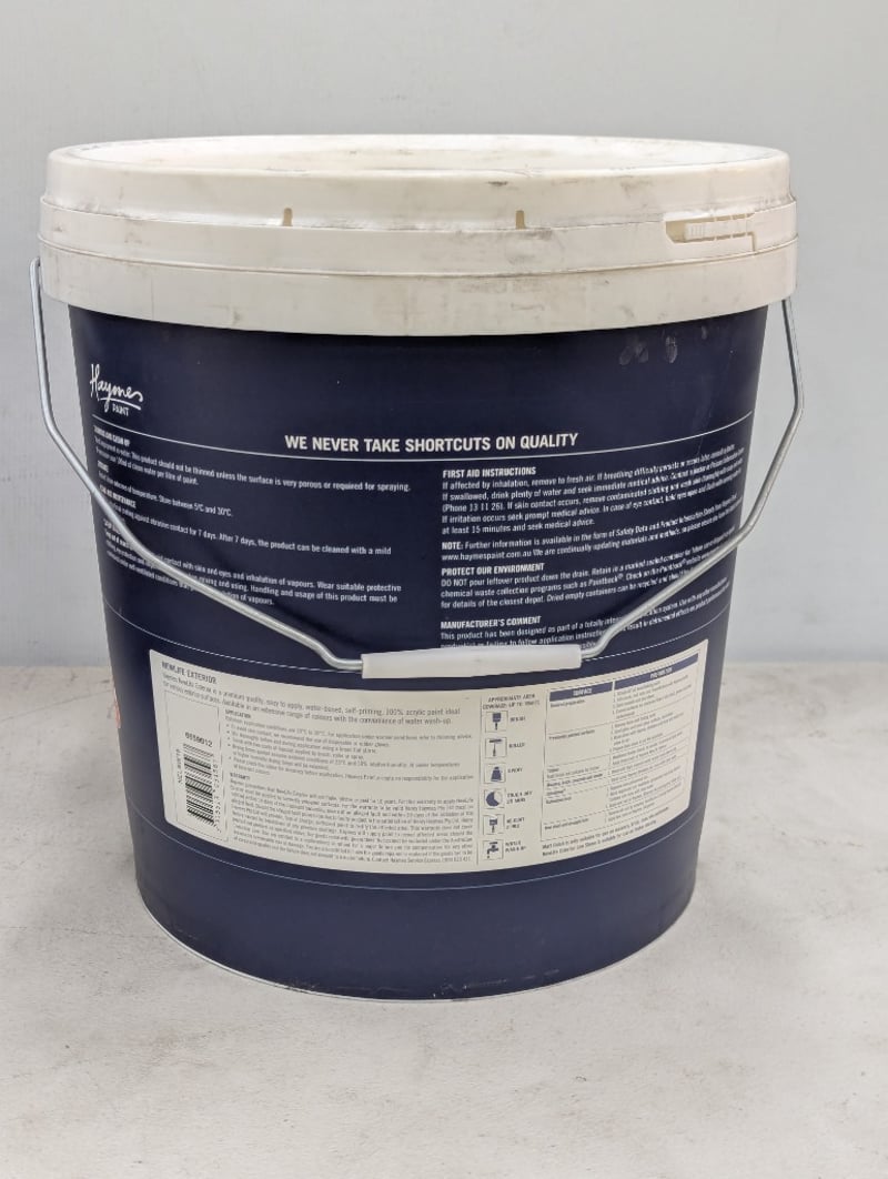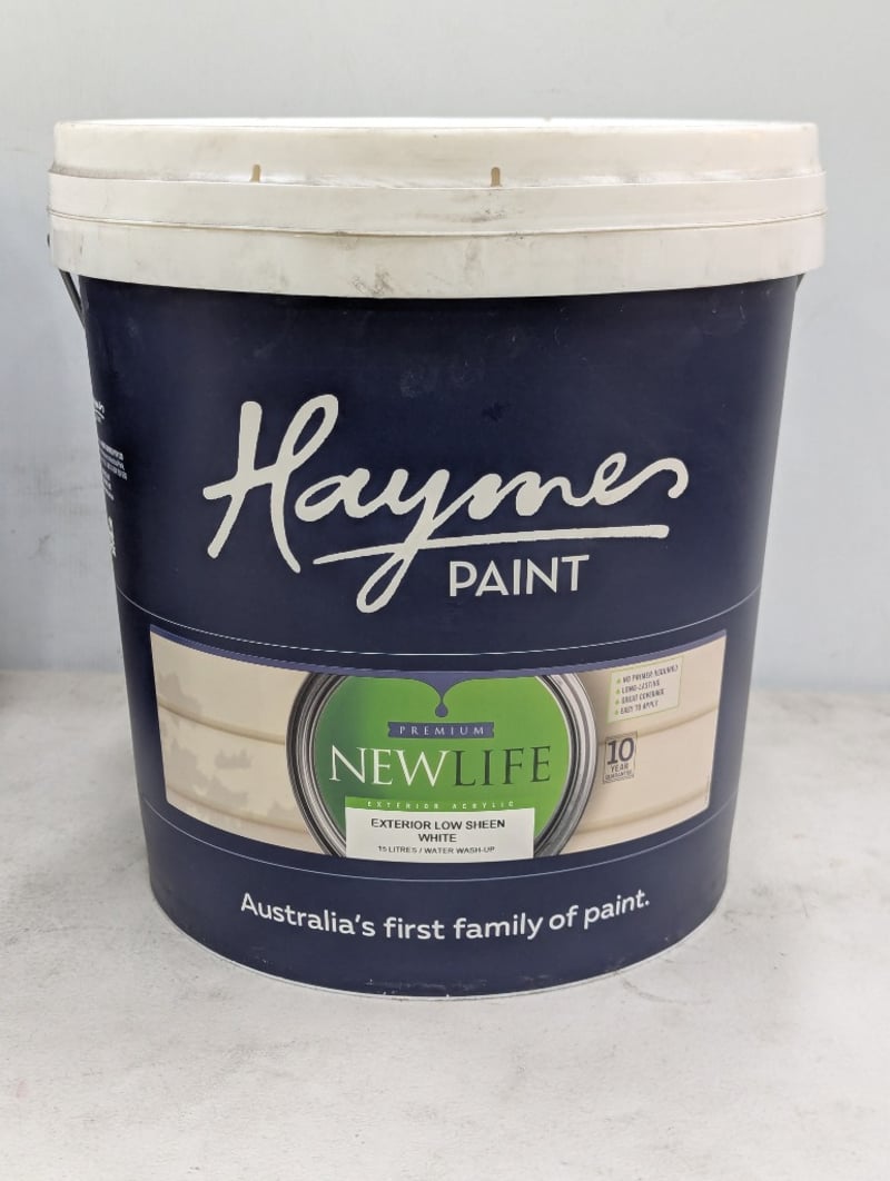 Paint, Haymes, Premium New Life, Exterior Low Sheen, White, 15 litres BID PER LITRE, MUST TAKE 15 LITRES