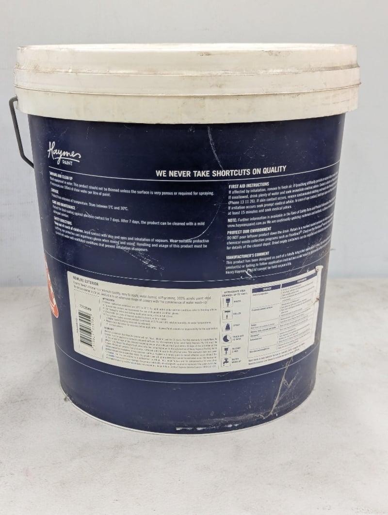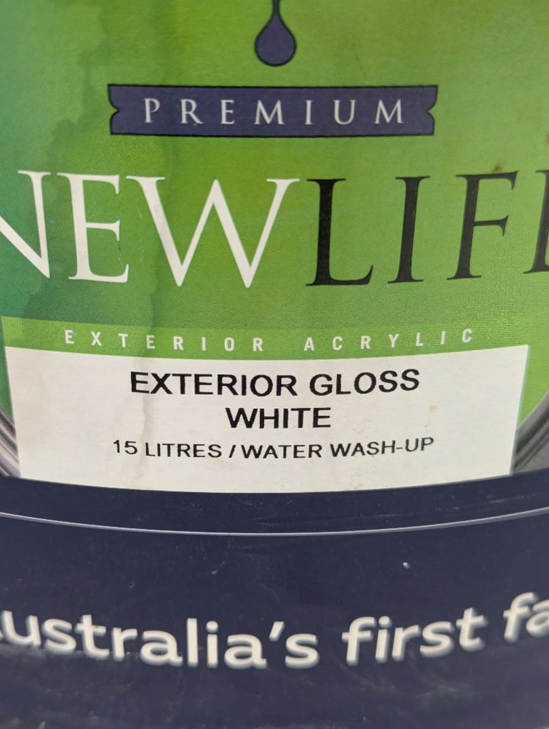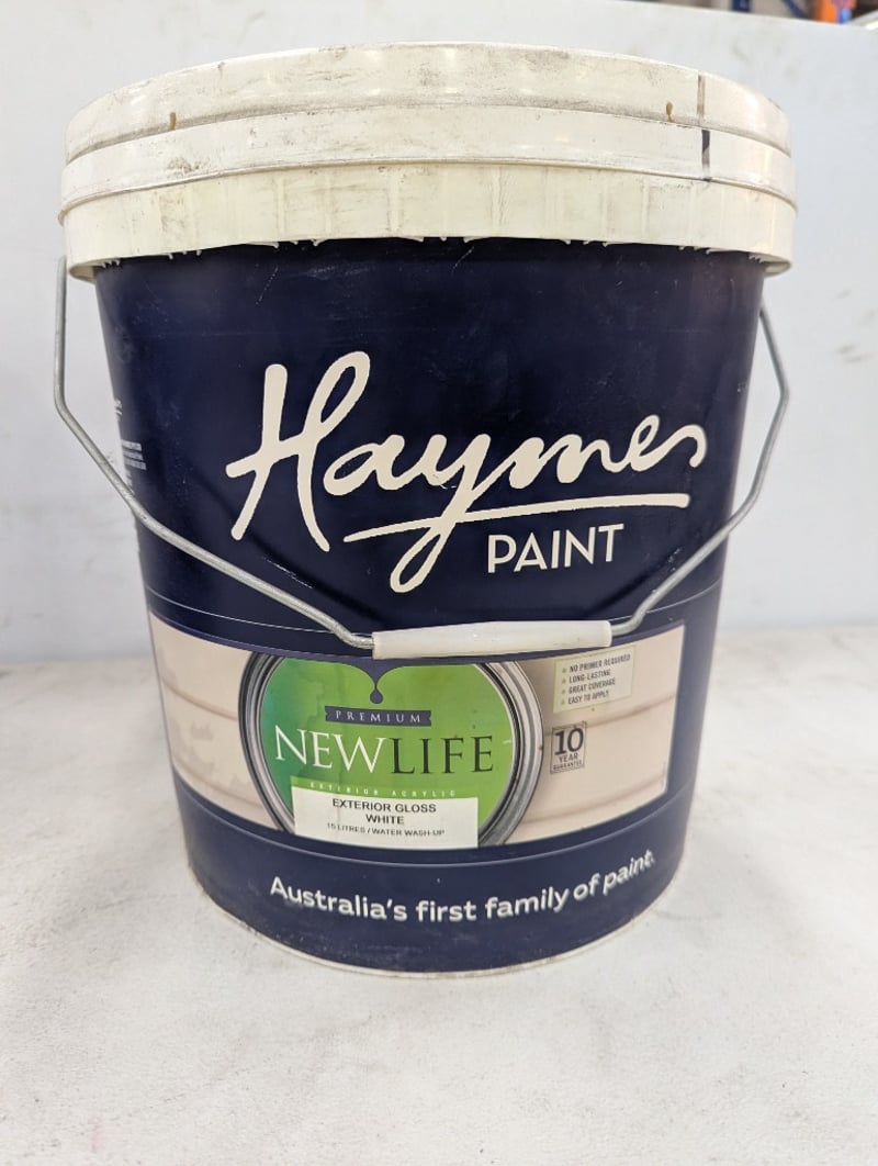 Paint, Haymes, Premium New Life, Exterior Gloss, White, 15 litres BID PER LITRE, MUST TAKE 15 LITRES