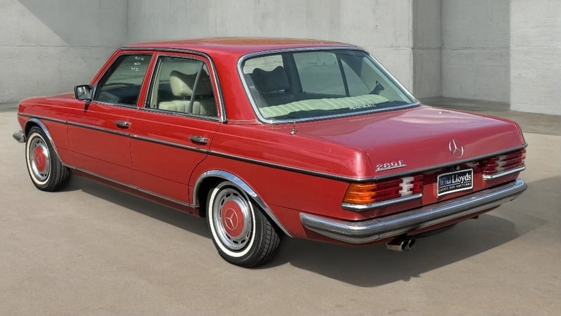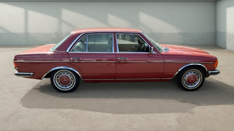 1977 MERCEDES-BENZ 280E - RED WITH WHITEWALLS AND RED RIMS - BEIGE LEATHER - 2.8L TWIN-CAM SIX
