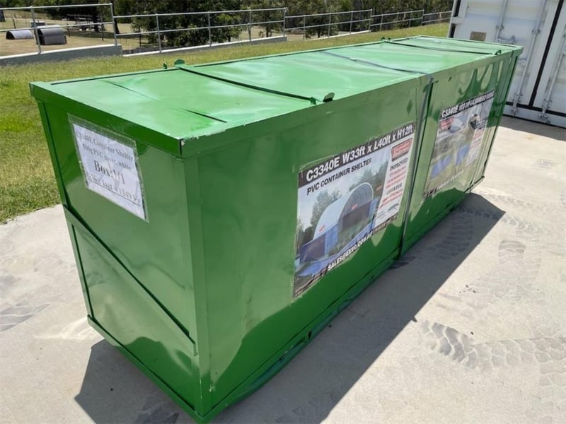 Unused Heavy duty 40ft Container Shelter with End Wall, Model: C3340E, 40ft long x 33ft wide x12ft high, Heavy duty PVC fabric, galvanised tube frame, Approximate Shipping Dimensions: 2830mm L x 750mm W x 1090mm H, Approximate Weight 1350kg Location: Ipswich, QLD
