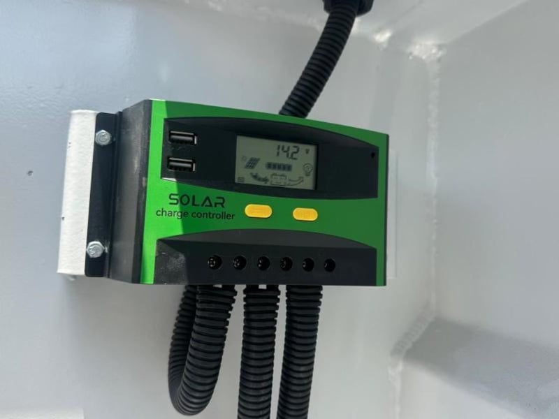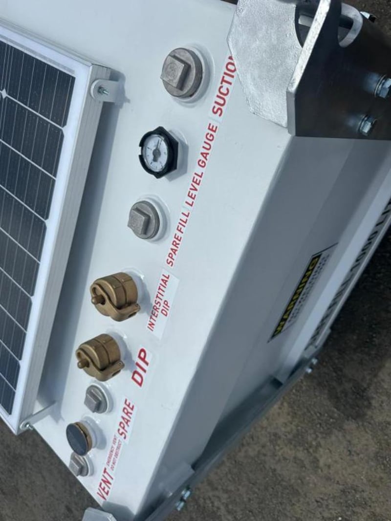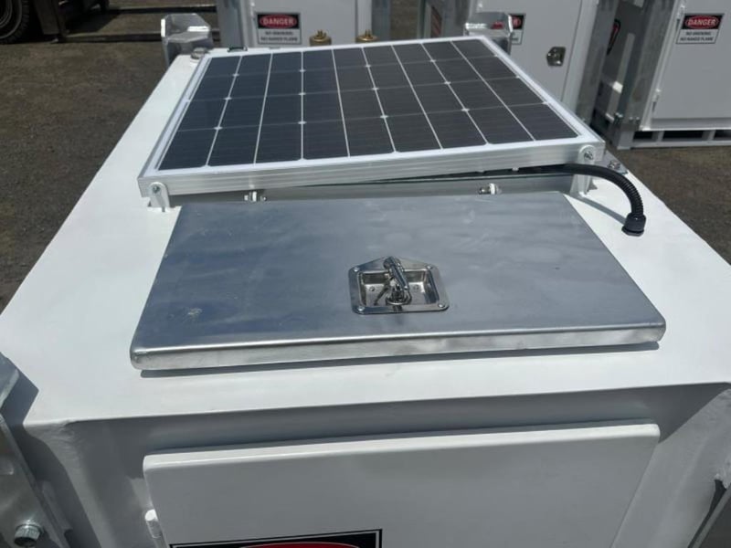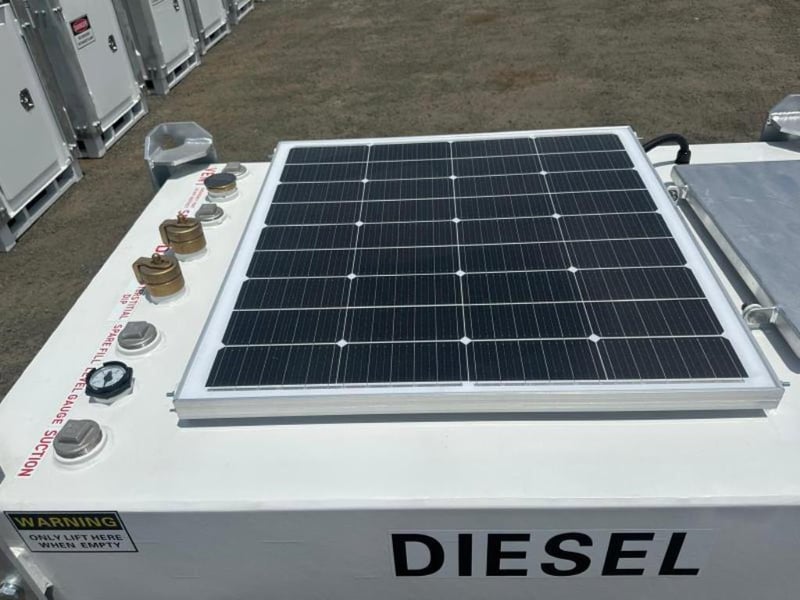 Unused 1000 Litre Bunded Fuel Storage Cube / Tank with Solar Powered Pump, Model: G1 Comes with Solar Panels, Hose, Nozzle , Pump & Meter, Safe Fill: 1000 Litres, Fork Pockets Galvanized Lifting Lugs, TARE: 690kg, Approximate Dimensions: 1642mm L x 1102mm W x 1280mm H Serial No: G125092003 Location: Ipswich, QLD
