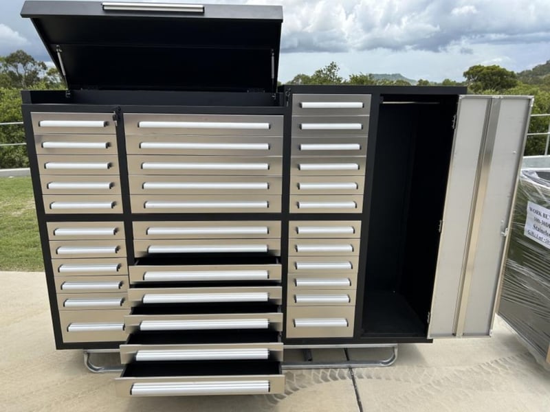 Unused 35 Drawer Stainless Steel Tool Storage Chest, Model: 7ft-35D, 35 Drawers, 3 Part Sliding Drawer System, Lockable Drawers – Various Sizes, Approximate Shipping Dimensions: L 2200mm x W 580mm x H 1600mm, Weight: 318Kg Location: Ipswich, QLD