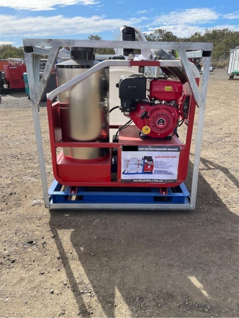 Unused Heated Pressure Washer / Water Blaster with Tank, 3600PSI, Key Start, Diesel Fired Burner, Various Spray Nozzles, Lance / Gurney, Skid Mounted with Fork Pockets, Heavy Duty Steel Frame, Work Lights, Approximate Shipping Dimensions: 2220mm L x 1240mm H x 1140mm W, Approximate Weight: 350kg Location: Ipswich, QLD