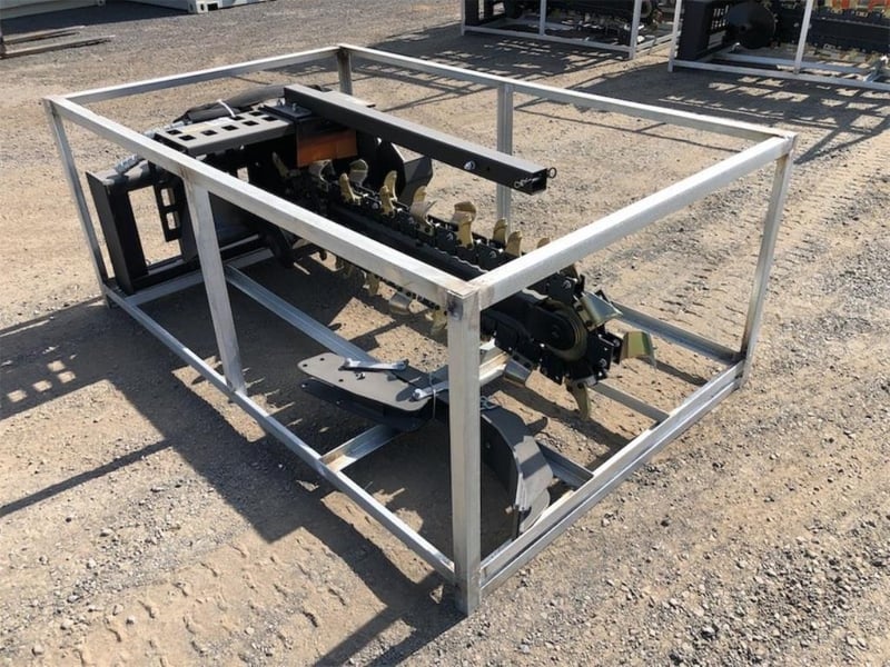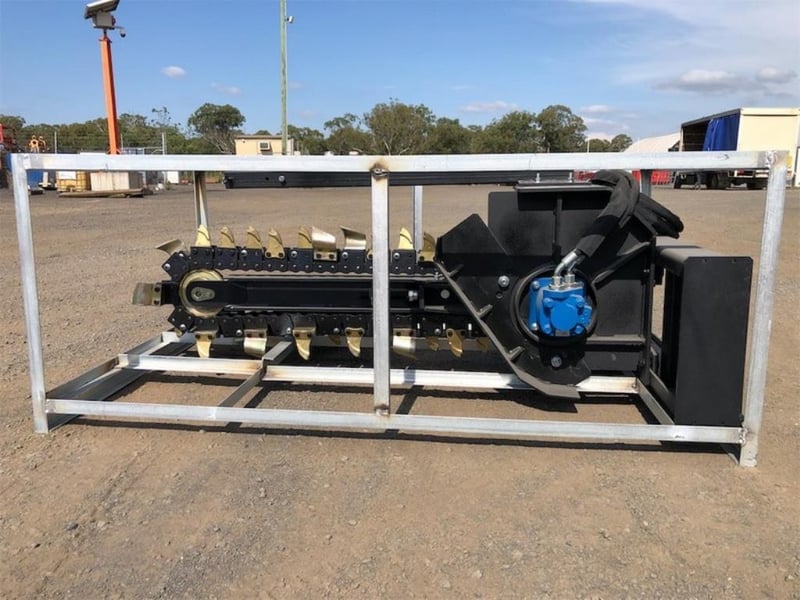 Unused Trencher Attachment for Skid Steer Loader, digging Width: 200mm, Digging Depth : 900mm, Required flow: 50-75 L/Min, Approximate Shipping Dimensions: 1900mm L x 1240mm W x 790mm H, Approximate Weight: 360kg Location: Dubbo, NSW