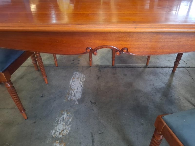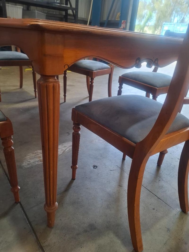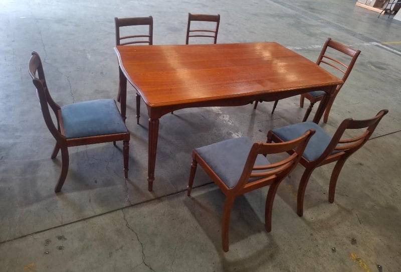 Timber dinning table , 6 x timber chairs with light blue cushion Dimensions: 168mm(W) x 91mm(D) x 78mm(H) NOTE: INSPECTIONS HIGHLY RECOMMENDED NOTE: PICK UP ONLY NOTE: MUST BE COLLECTED WITHIN 48 HOURS OF AUCTION