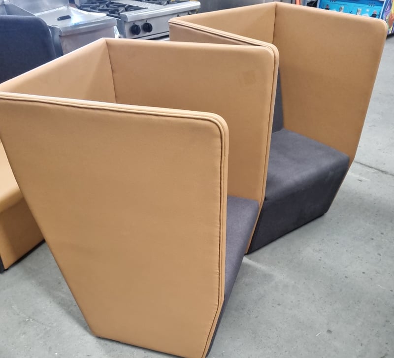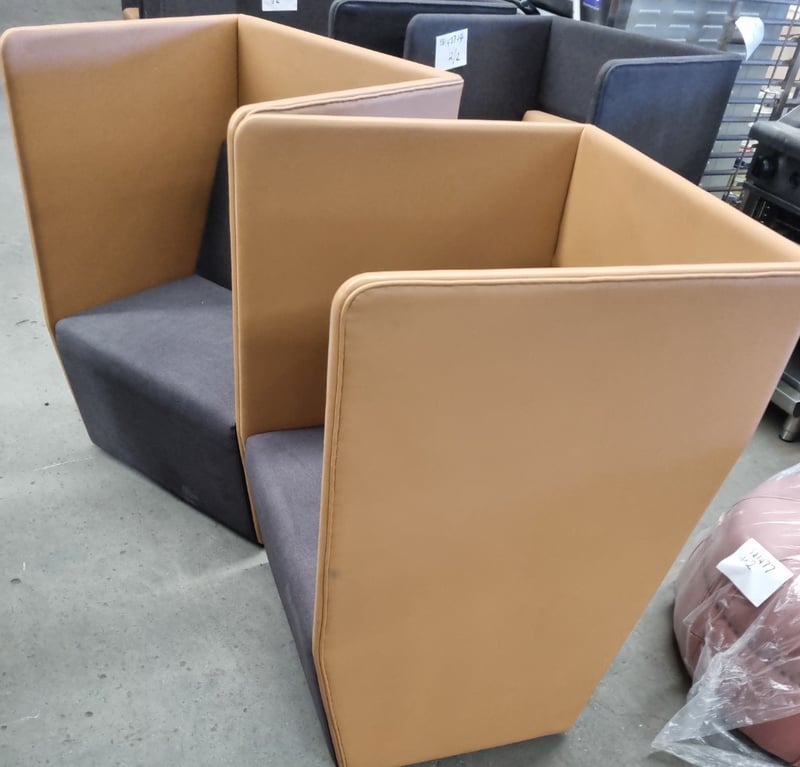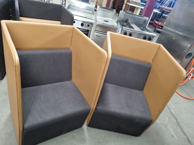 Pair of contemporary high-backed armchairs featuring a striking two-tone upholstery design. Each chair showcases tan/caramel leather fabric on the back and sides with contrasting charcoal upholstery. Sold as lot Dims: 102 x 100 x 120cm Note: Signs of wear
