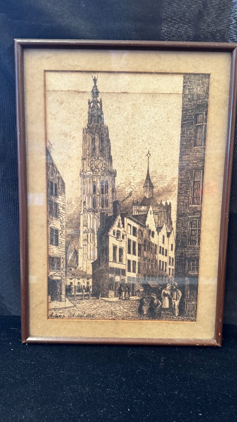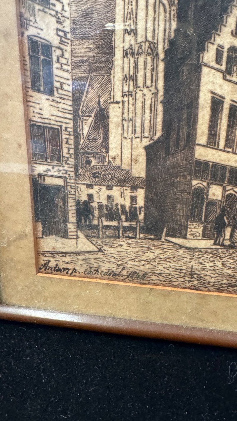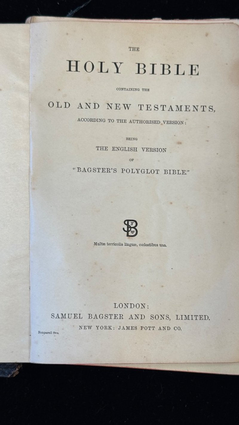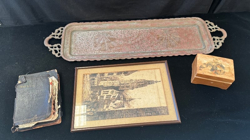 COLLECTION OF TRINKETS Curated Collection Comprising Ornate Brass Serving Trays With Pierced Handles And Patinated Surfaces; Swiss-Made Music Boxes (Thorens And Reuge Mechanisms) In Wooden Cases With Decorative Inlay; Hand-Coloured Architectural Engraving Depicting A Gothic Cathedral Street Scene, Signed And Framed; Two Antique Leather-Bound Bibles Including A Bagster'S Polyglot Edition (Samuel Bagster & Sons, London) And Oxford University Press Edition; Vintage Hardcover Book With Gilt Lettering; All Items Displaying Condition: Fair - Refer To Images 584443+7
