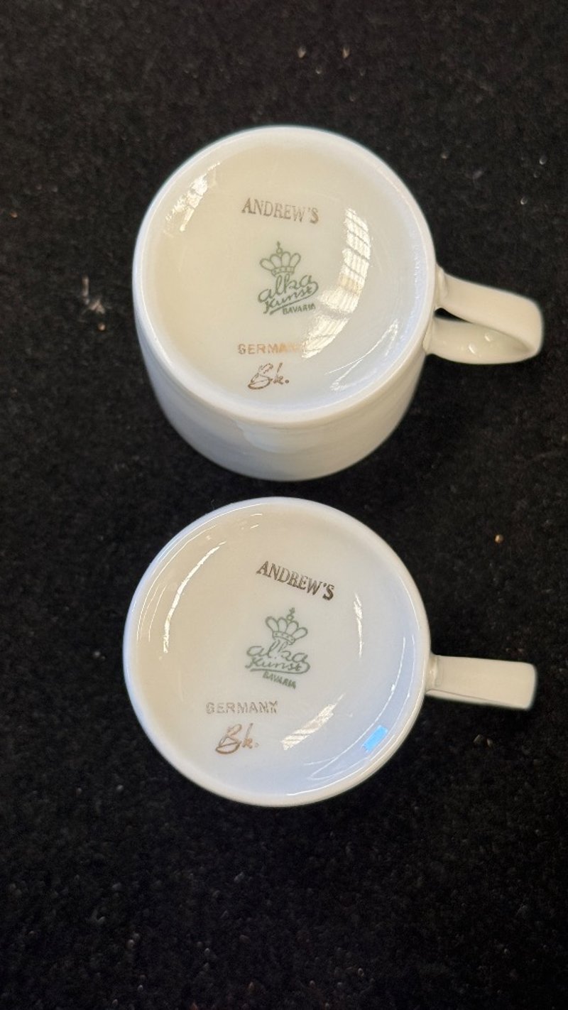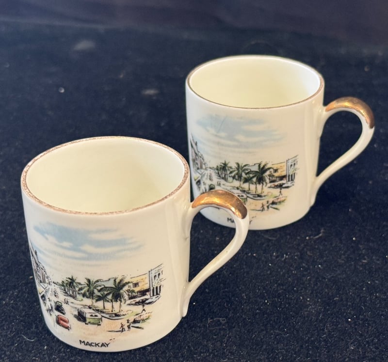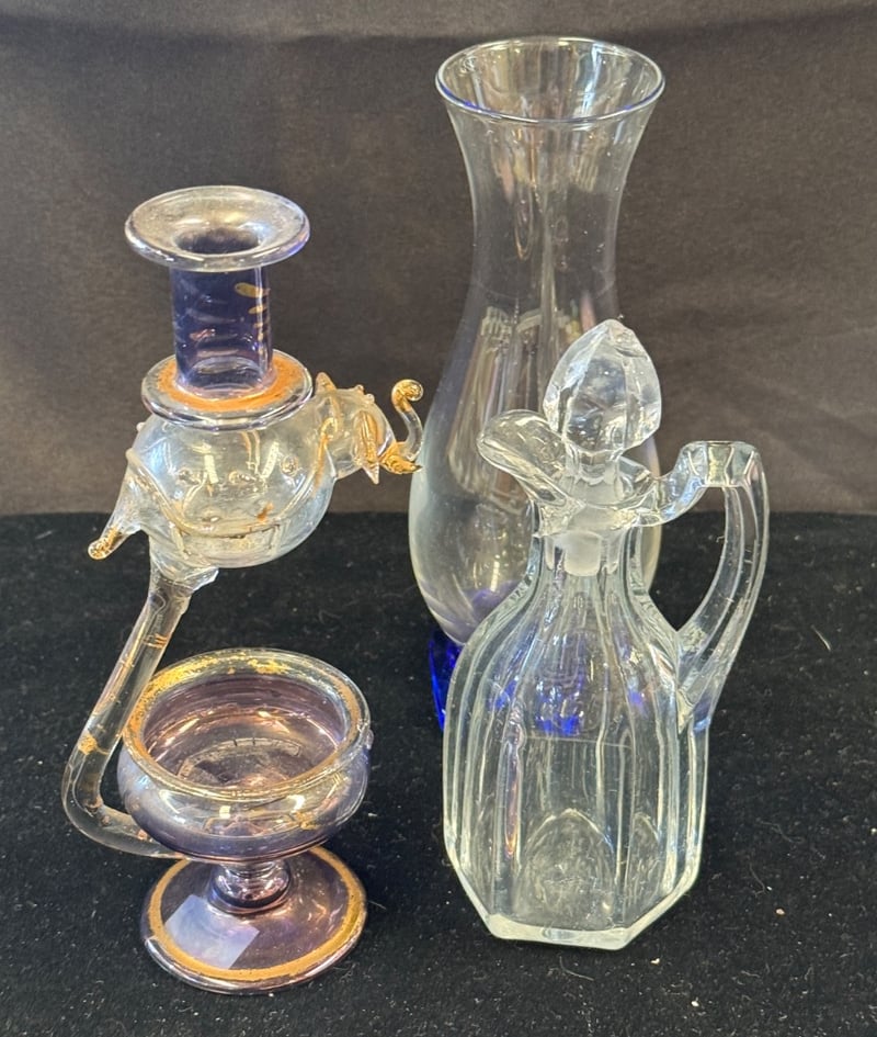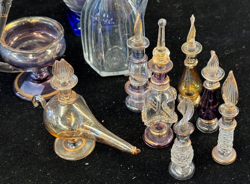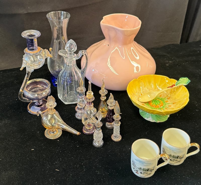 COLLECTION OF GLASSWARE, PORCELAIN AND COLLECTIBLES Eclectic Collection Comprising Vintage Glass Perfume Bottles With Stoppers In Various Colours (Amber, Clear, Cobalt), A Pink Glazed Ceramic Vase With Incised Decoration, Andrew'S German Porcelain Mugs Featuring Mackay Beach Scene Transfers With Gilt Rims, A Yellow Ceramic Leaf-Form Dish With Hand-Painted Floral Centre And Matching Spoon, Clear Glass Decanters With Gilt Accents, And Decorative Glassware Including A Pedestal Bowl With Blue Glass Insert. Mixed Provenance And Periods. Condition: Good - Refer To Images 584443+10