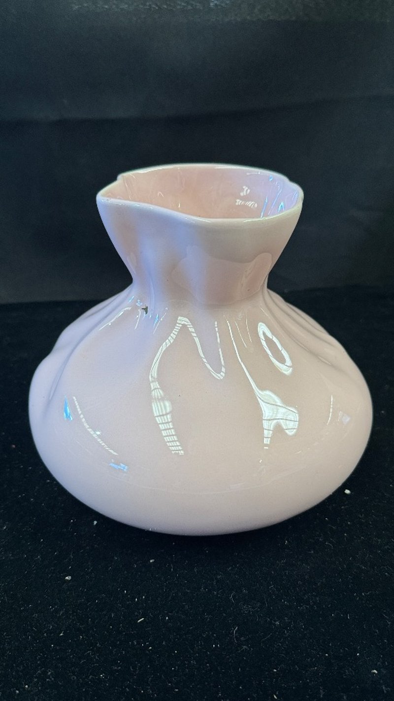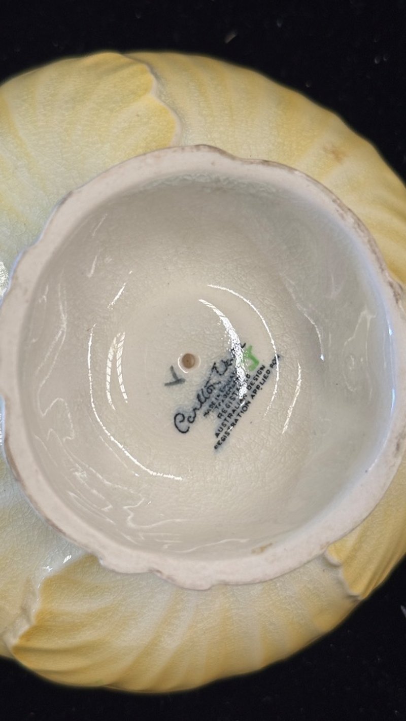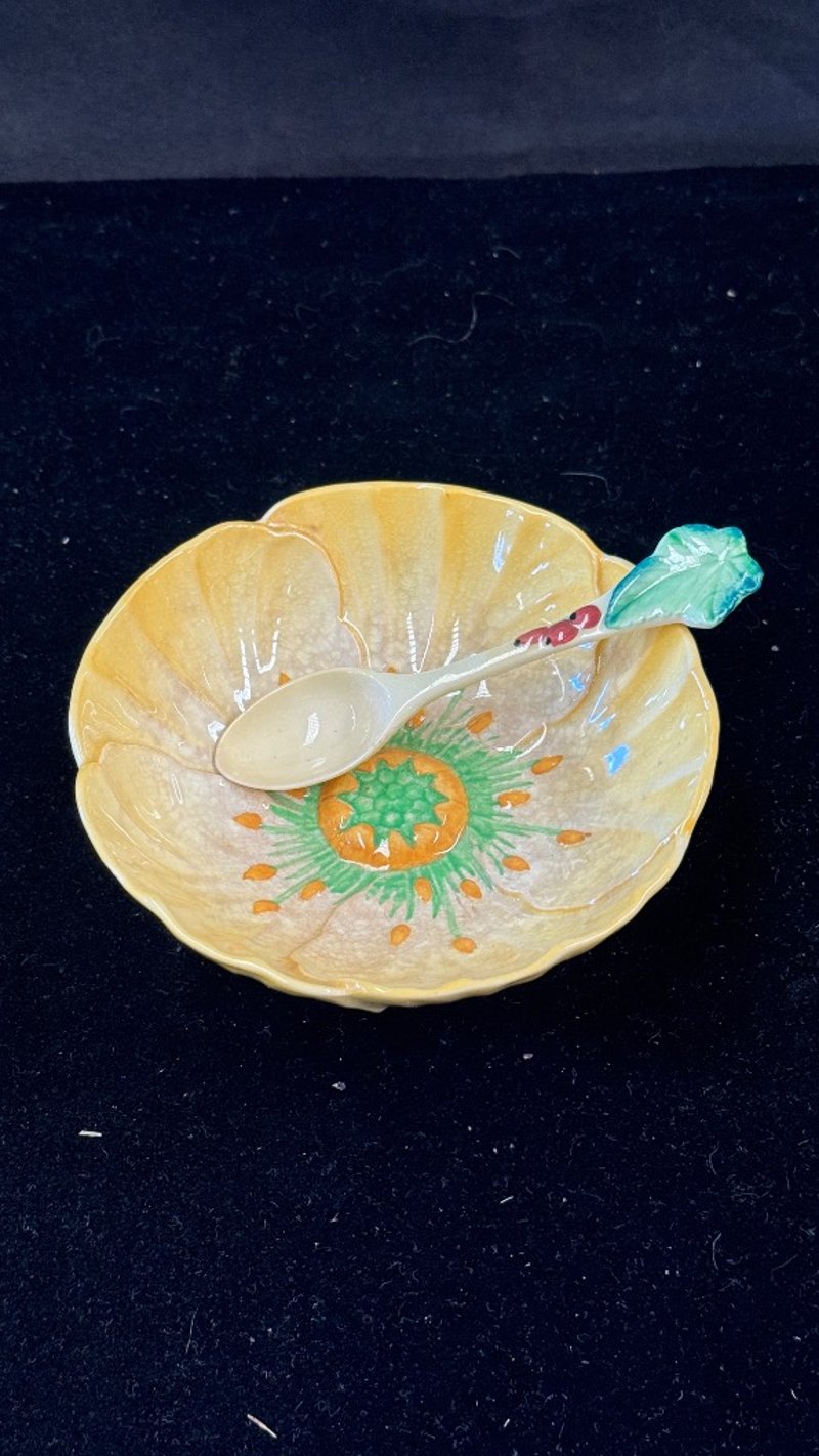 COLLECTION OF GLASSWARE, PORCELAIN AND COLLECTIBLES Eclectic Collection Comprising Vintage Glass Perfume Bottles With Stoppers In Various Colours (Amber, Clear, Cobalt), A Pink Glazed Ceramic Vase With Incised Decoration, Andrew'S German Porcelain Mugs Featuring Mackay Beach Scene Transfers With Gilt Rims, A Yellow Ceramic Leaf-Form Dish With Hand-Painted Floral Centre And Matching Spoon, Clear Glass Decanters With Gilt Accents, And Decorative Glassware Including A Pedestal Bowl With Blue Glass Insert. Mixed Provenance And Periods. Condition: Good - Refer To Images 584443+10