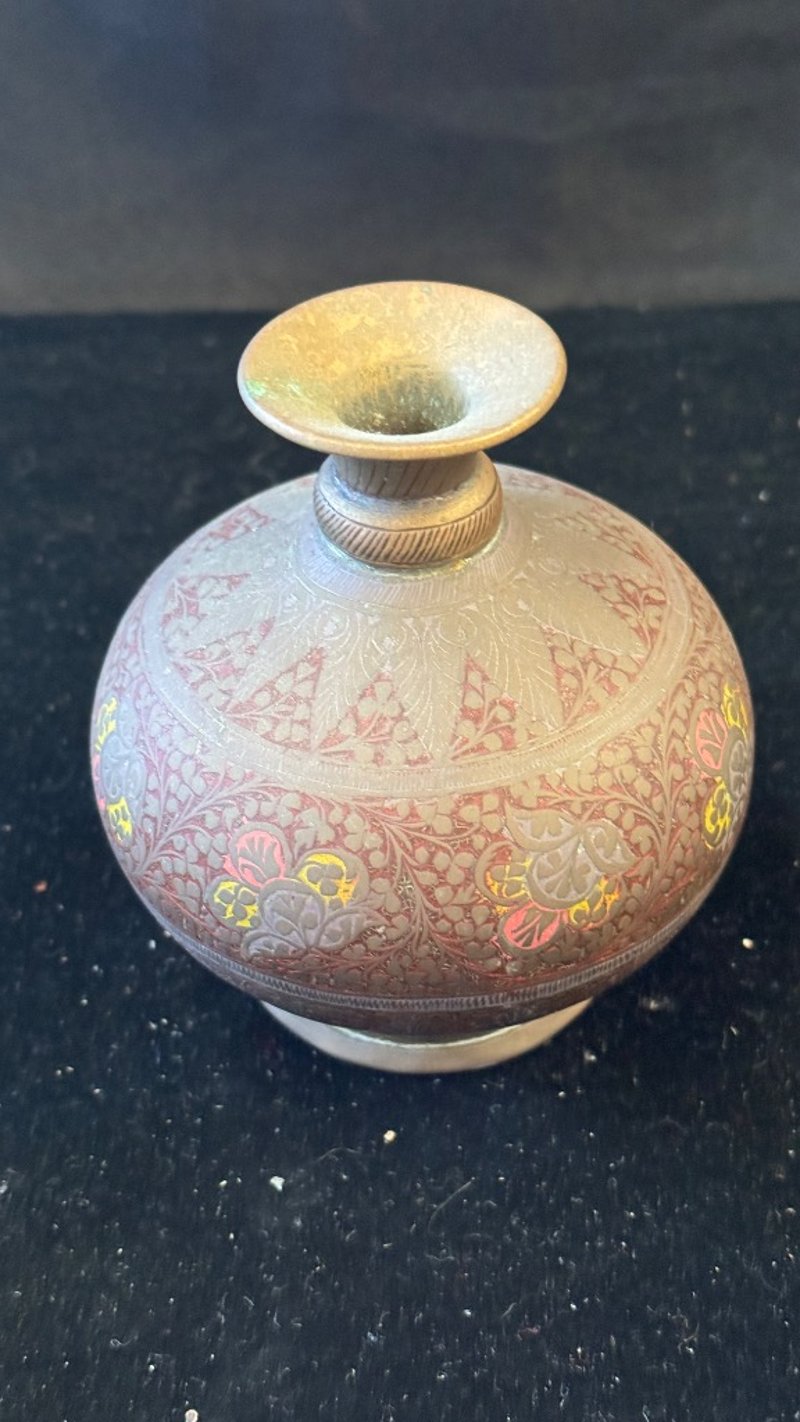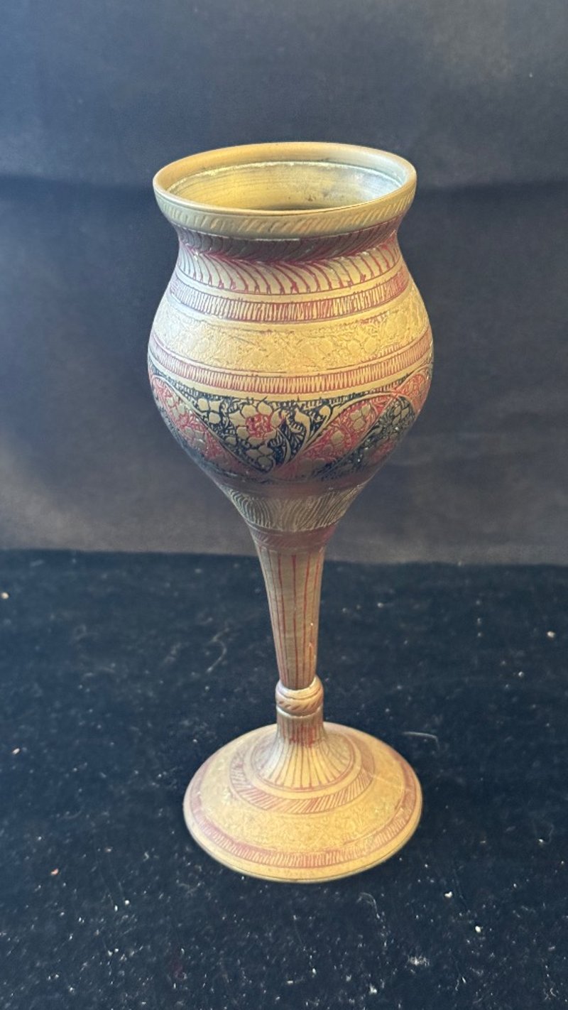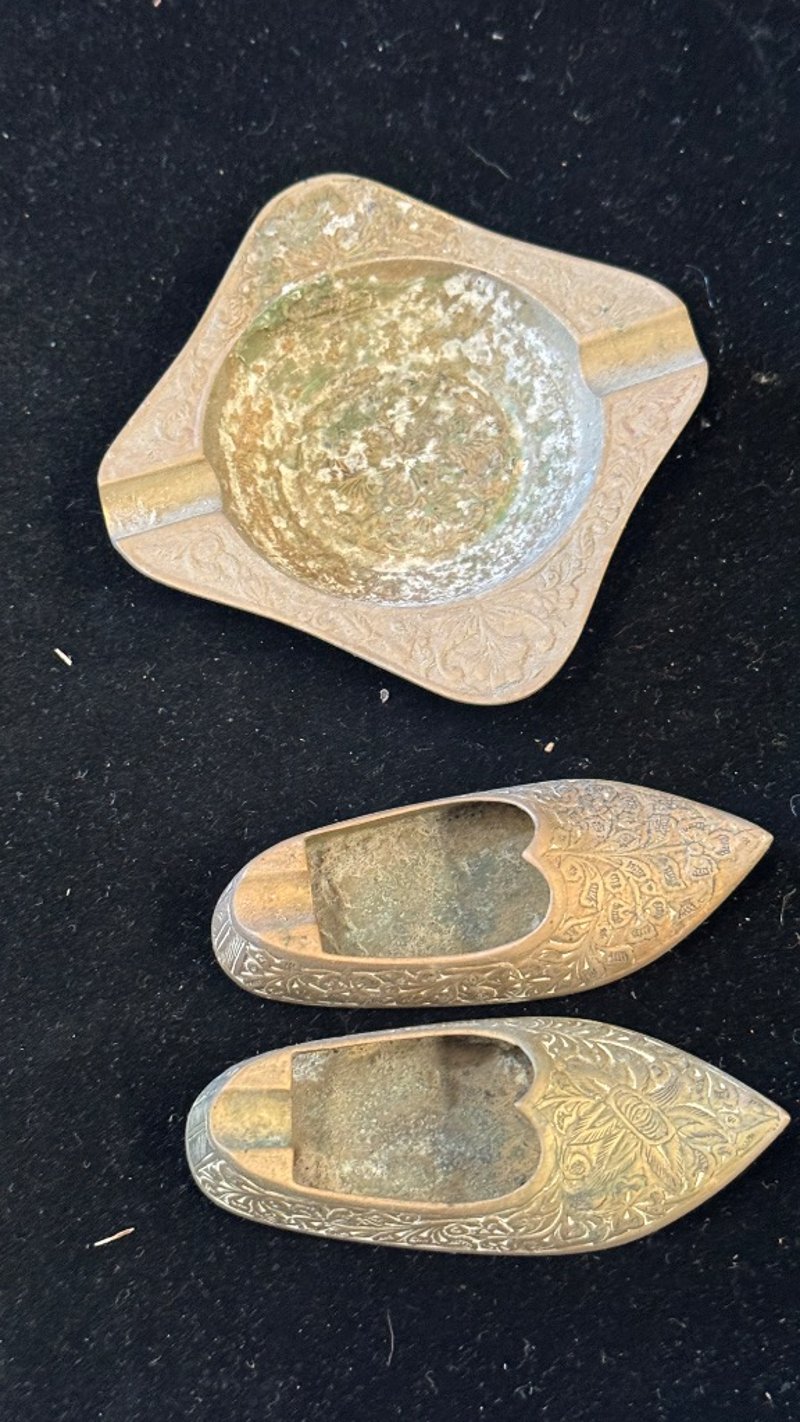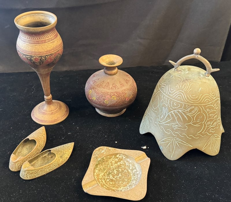 SOUTHEAST ASIAN BRASS DECORATIVE OBJECTS COLLECTION Item Size: Height: 20cm, Width: 12cm, Depth: 10cm Curated Collection Of Six Brass Pieces Featuring Intricate Repousse And Engraved Detailing. Includes A Pedestal Goblet With Polychrome Enamel Inlay Depicting Floral Motifs, A Spherical Vessel With Radiating Pattern Work, A Bell-Shaped Container With Zoomorphic Relief Carving, A Pair Of Elongated Shoe-Form Vessels With Ornamental Filigree, And A Quadrilateral Dish With Concentric Circular Embossing. All Pieces Exhibit Characteristic Southeast Asian Craftsmanship With Layered Decorative Banding An Condition: Good - Refer To Images 584443+12