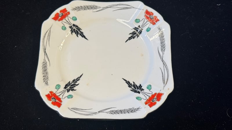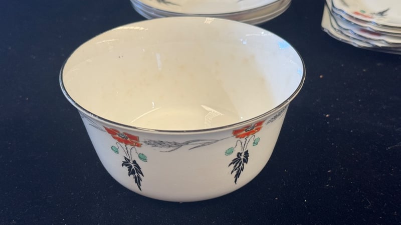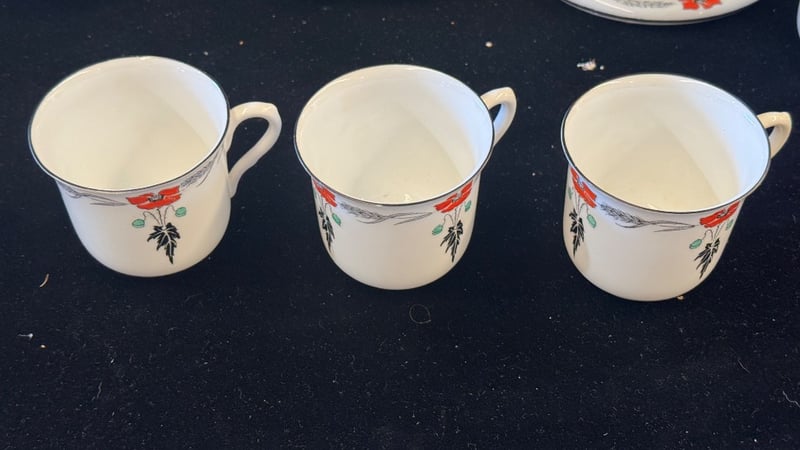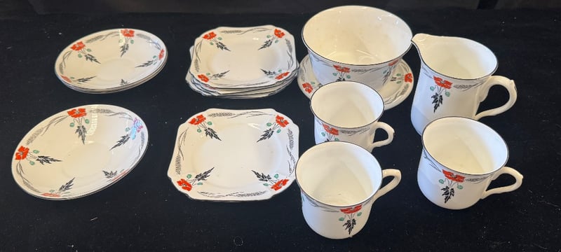 SHELLEY POPPY PATTERN PORCELAIN DINNERWARE SET English Porcelain Dinnerware Service By Shelley Featuring The Iconic Poppy Pattern With Red Poppies, Black Feathered Foliage, And Green Berries On Cream Ground. Set Comprises Six Dinner Plates (Two Round, Four Square), Six Teacups With Handles, And One Large Serving Bowl. Hand-Painted Floral Decoration With Delicate Botanical Motifs. Marked With Shelley Maker'S Mark To Base. Vintage Early 20Th Century Production. Condition: Good - Refer To Images 584443+13