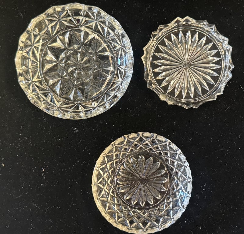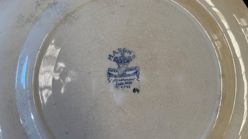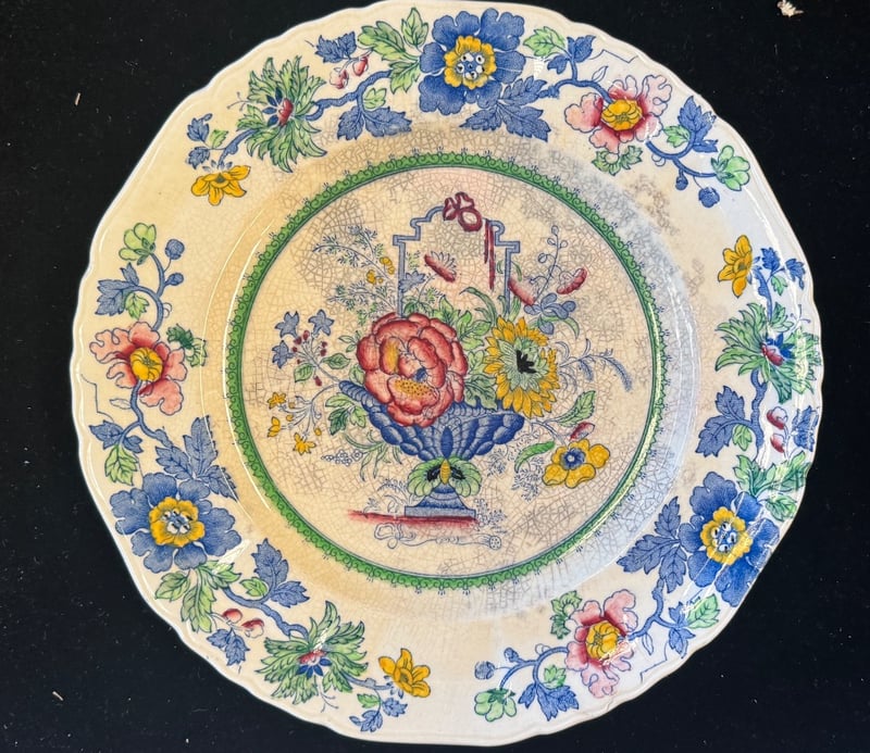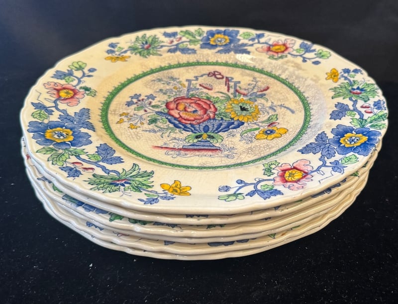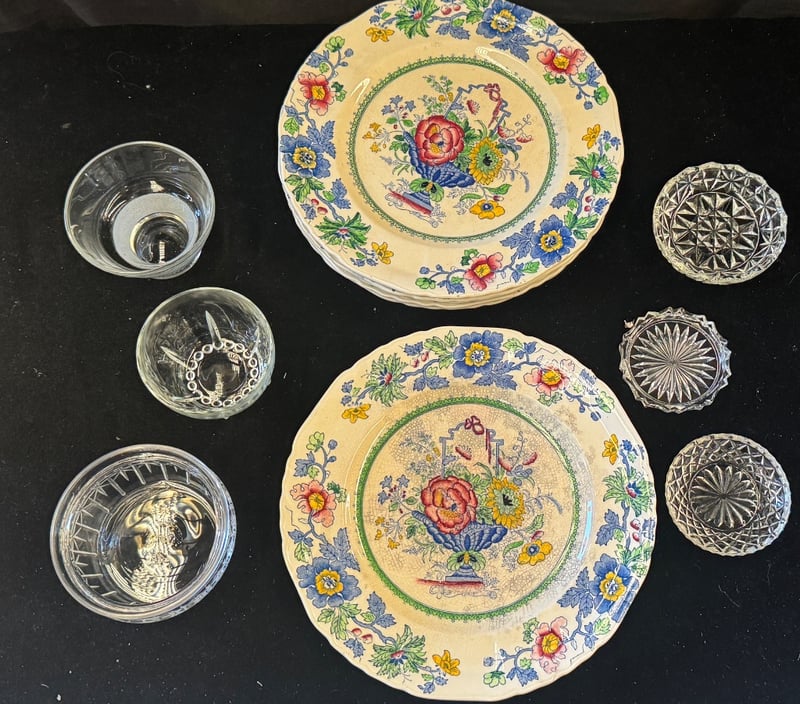 MASON'S PATENT IRONSTONE DINNERWARE AND GLASSWARE A Comprehensive Mason'S Ironstone Dinner Service Comprising Multiple Hand-Painted Floral Plates Featuring Vibrant Botanical Motifs In Blue, Red, Yellow And Green On A Cream Ground With Green Decorative Borders. The Set Includes Stacked Dinner Plates With Central Urn And Floral Arrangements, Accompanied By A Collection Of Cut Glass Bowls And Vessels Displaying Geometric Star And Radiating Fan Patterns. Condition: Fair - Refer To Images 584443+15