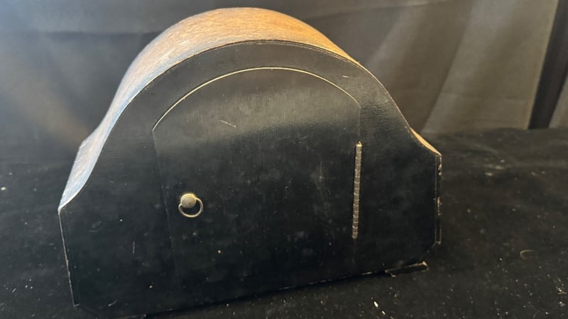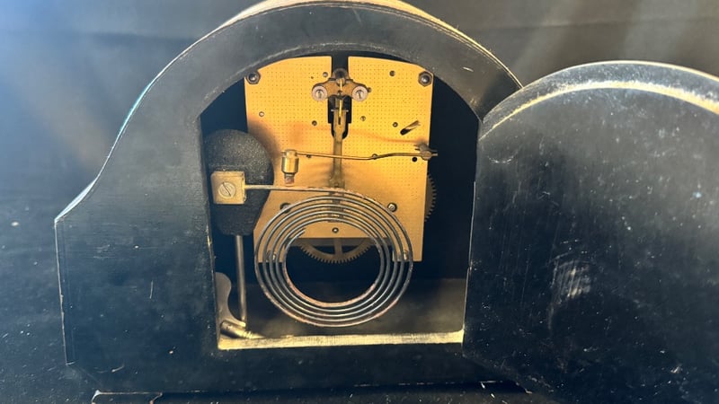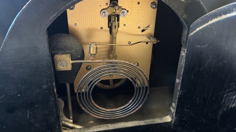 Smiths Mantel Clock Featuring A Curved Wooden Case With Arched Top, Brass Bezel, And Cream-Coloured Dial With Arabic Numerals. The Mechanical Movement Displays Visible Brass Gears, Spiral Mainspring, And Escapement Mechanism. Black Bakelite Rear Casing With Access Door. Two-Train Movement With Pendulum Regulation. Classic Mid-20Th Century Design Exemplifying British Horological Craftsmanship.