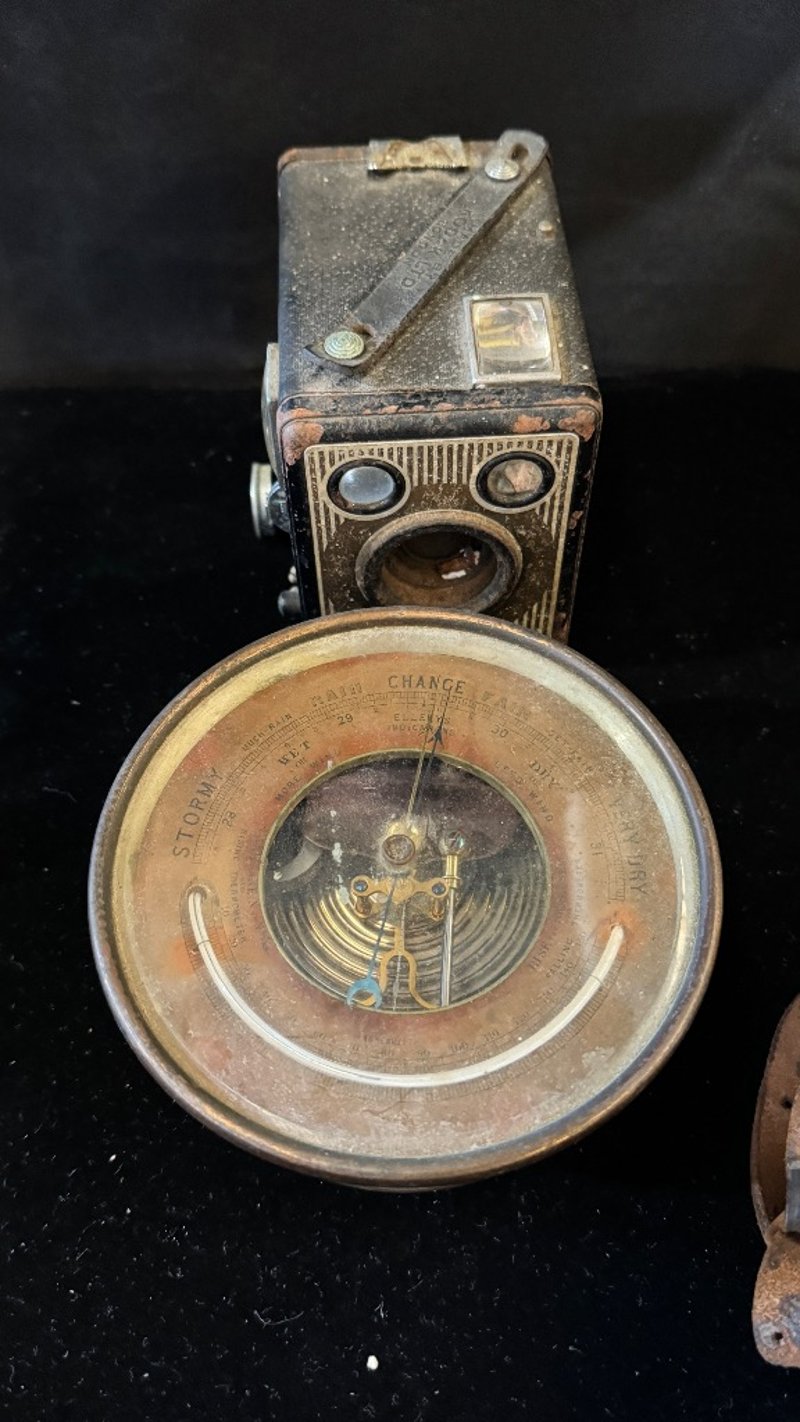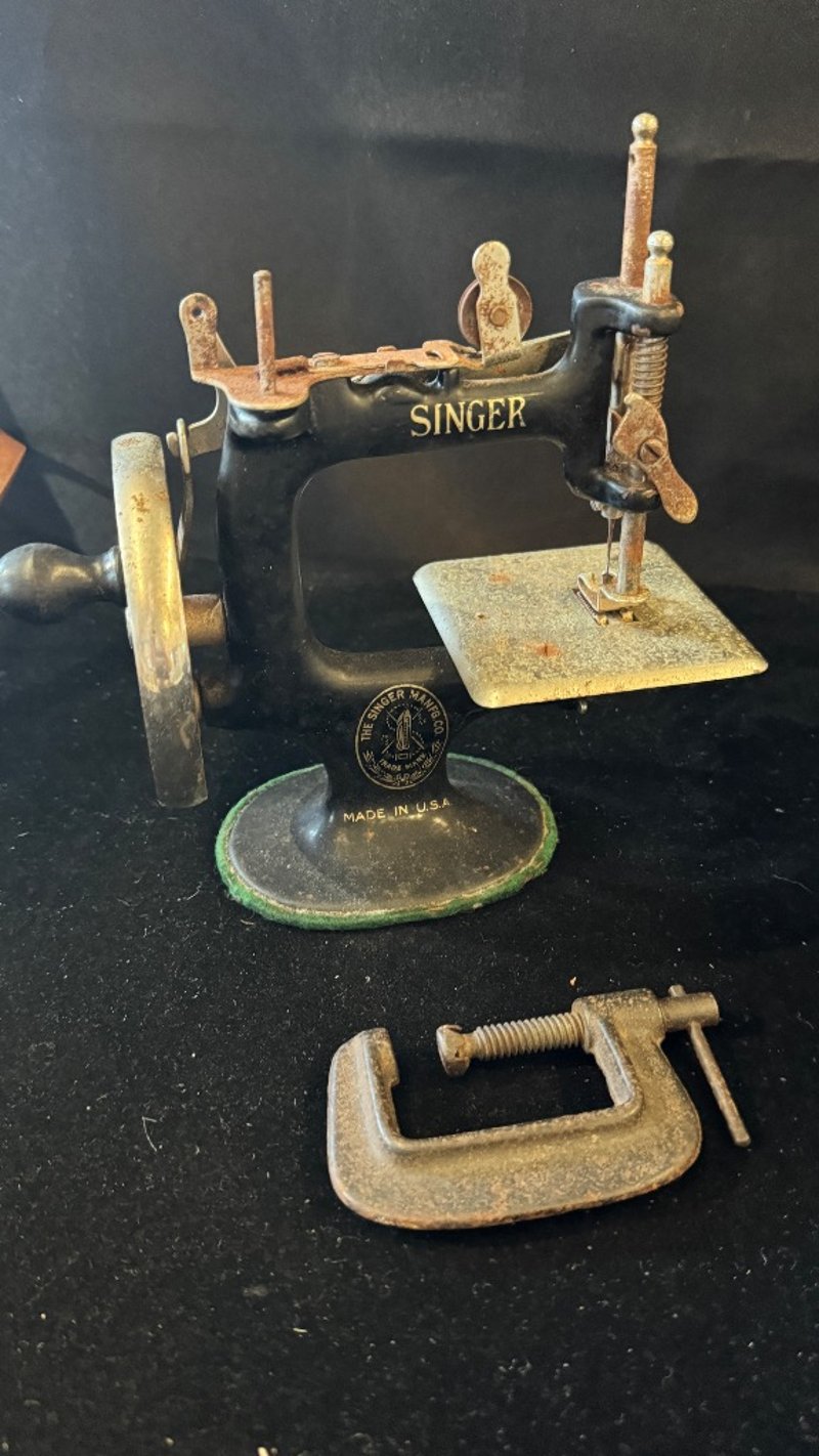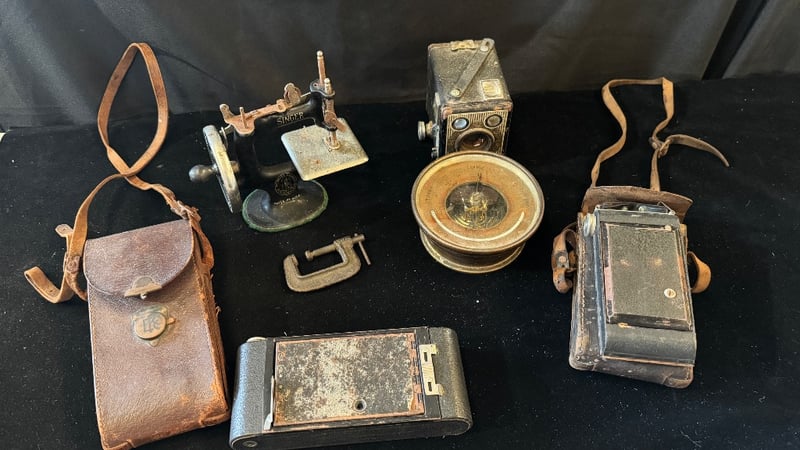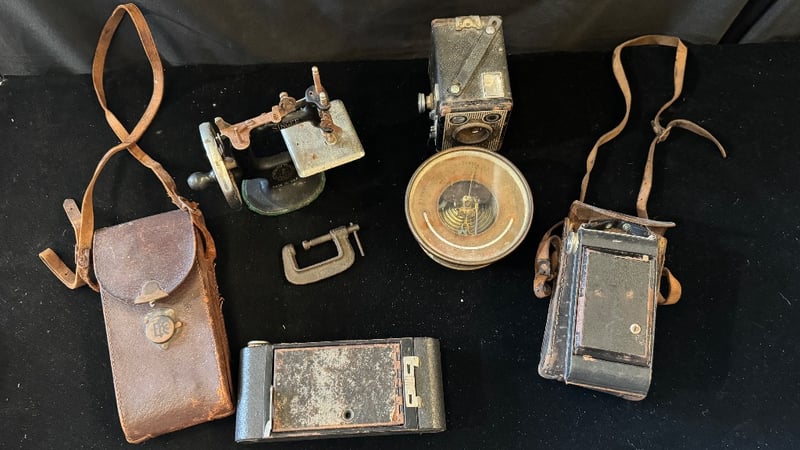 VINTAGE PHOTOGRAPHY EQUIPMENT COLLECTION - EARLY 20TH CENTURY CAMERAS, ACCESSORIES & SEWING MACHINE Comprehensive Antique Photography Collection Featuring Two Folding Cameras With Leather Carrying Cases, Brass Exposure Meters With Calibrated Dials, Vintage Enlarger Equipment, Metal Clamps And Stands, And A Miniature Singer Sewing Machine (Usa-Made). Includes Original Leather Shoulder Bags With Brass Fittings And Period Accessories. The Collection Represents Early-To-Mid 20Th Century Photographic Technology With Mixed Patina And Aged Leather Components. Condition: Fair - Refer To Images 584443+19
