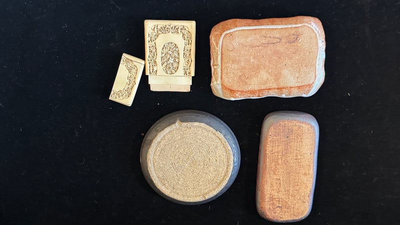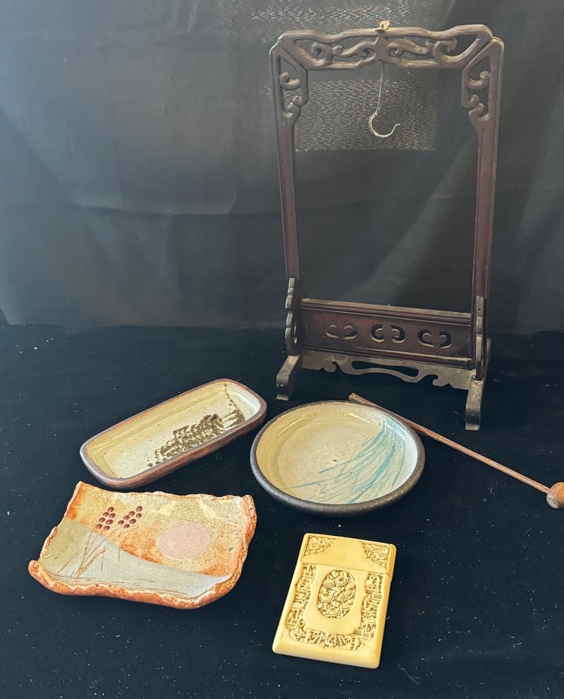 ASIAN DECORATIVE ARTS COLLECTION - JADE DISHES, WOODEN STAND, AND CARVED VESSELS Item Size: Height: 28cm, Width: 20cm, Depth: 15cm Curated Collection Comprising A Carved Hardwood Display Stand With Ornamental Top Rail And Decorative Base Panel, Accompanied By Five Jade And Stone Vessels Including Rectangular And Circular Dishes With Incised Detailing, A Carved Jade Plaque With Relief Ornamentation, And Ceramic Pieces Featuring Hand-Painted Embellishments In Earth Tones And Blue Accents. Pieces Exhibit Traditional Asian Craftsmanship With Varying Patinas Consistent With Age. Condition: Fair - Refer To Images 584443+20