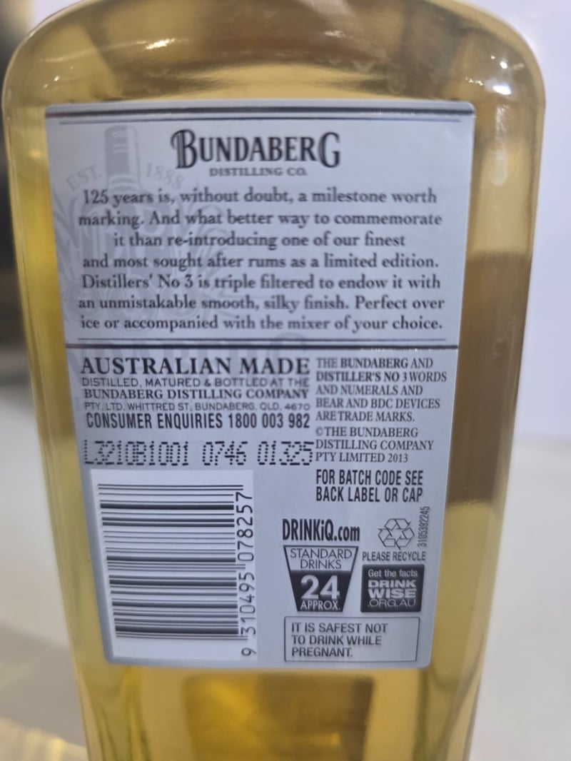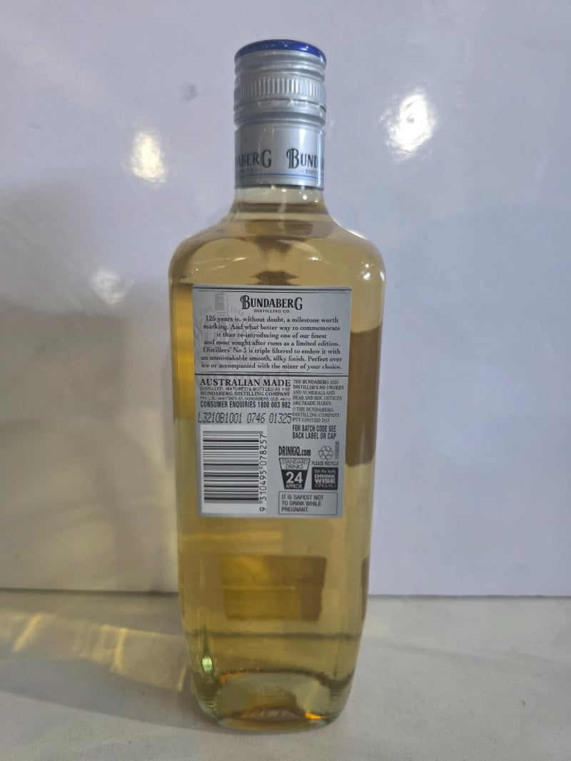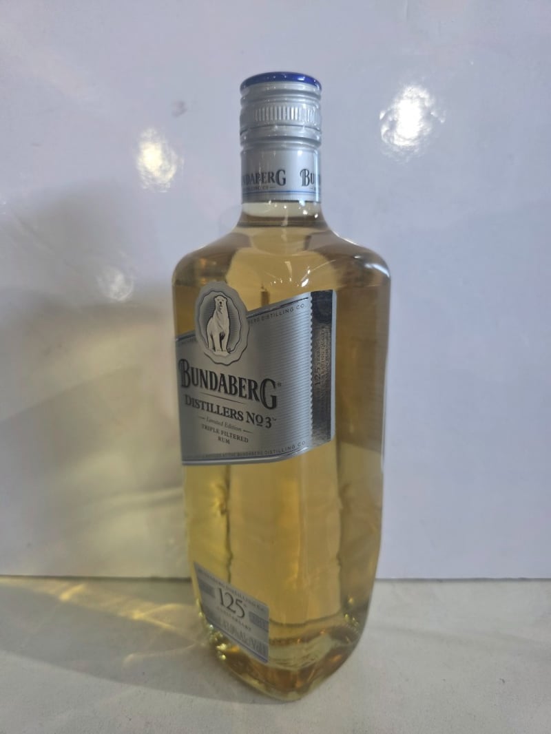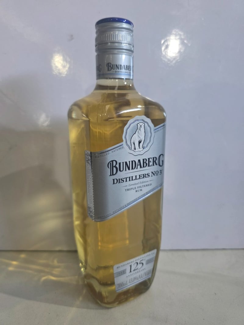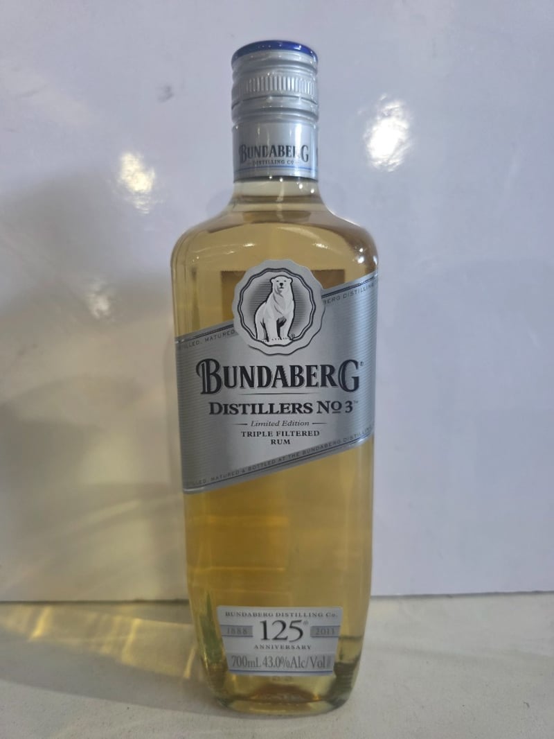 Bundaberg Distillers No 3 Limited Edition 125th Anniversary Triple Filtered Rum, 700ml bottle at 43.0% alcohol by volume. This commemorative release celebrates the distillery's 125-year milestone (1888-2013). The rum is triple filtered to achieve an unmistakable smooth, silky finish, suitable for enjoying over ice or with a mixer of choice. Australian-made and bottled at the Bundaberg Distilling Company, Queensland. Presented in original black presentation box with silver label detailing. The bottle features the iconic polar bear emblem and anniversary branding. Batch code visible on label. Condition reflects storage as a collectible item.