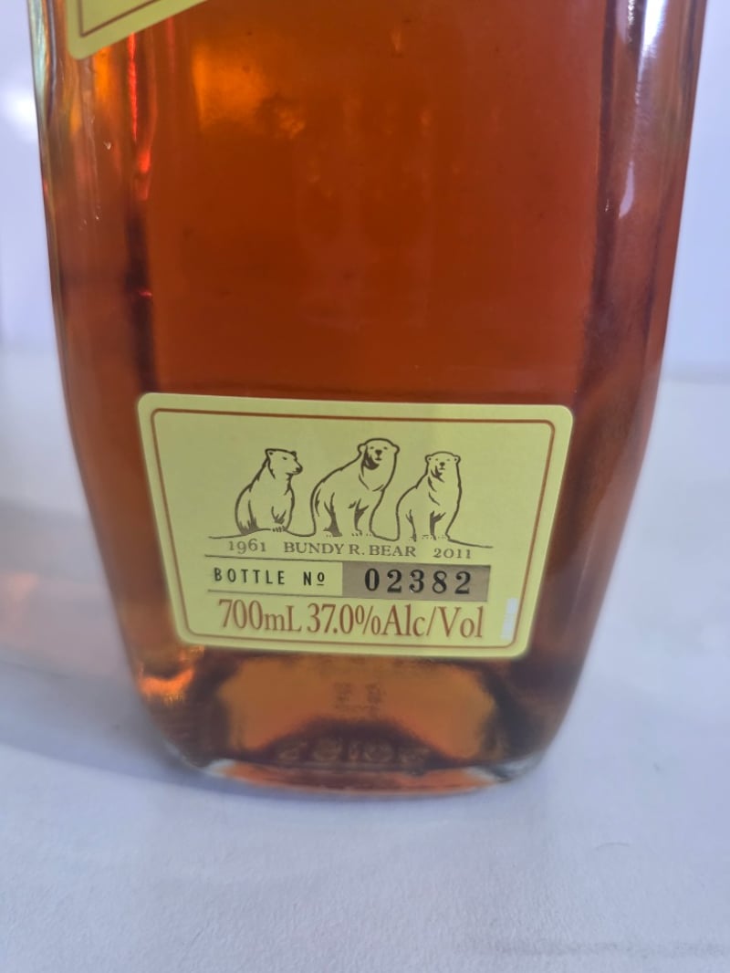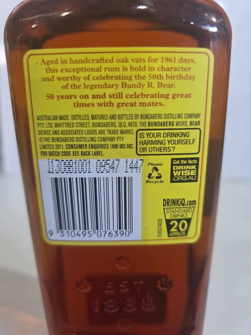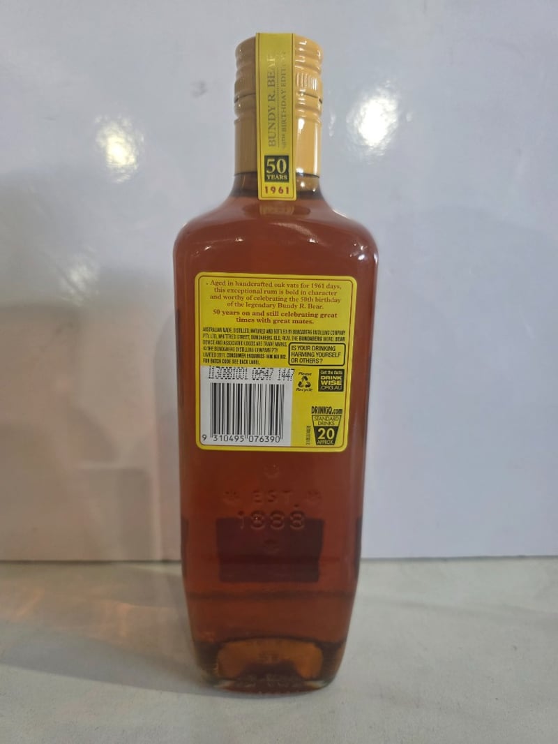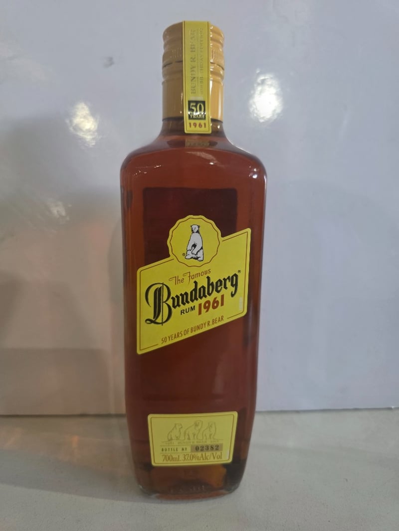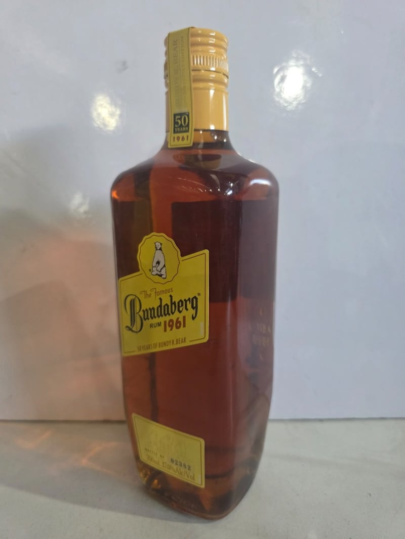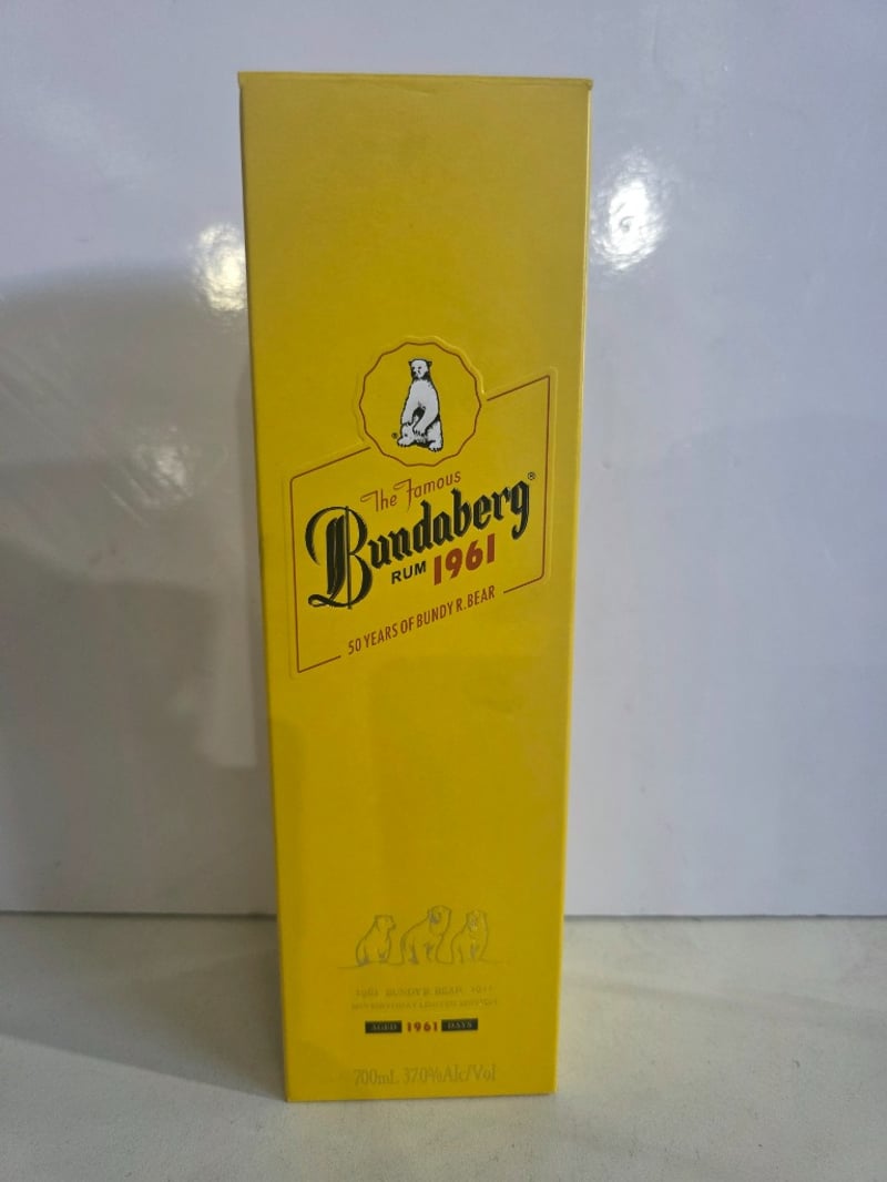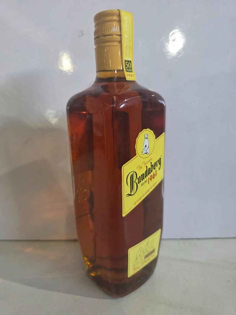 Bundaberg Rum 1961 50 Years Anniversary Limited Edition. This exceptional commemorative bottle celebrates the 50th birthday of the legendary Bundy R. Bear mascot. Aged in handcrafted oak vats for 1961 days, this premium Australian rum is bold in character and worthy of celebration. Bottled by Bundaberg Distilling Company, Whittred Street, Bundaberg, Queensland. 700ml bottle at 37.0% alcohol by volume. Bottle number 02382. The rum displays a rich amber colour and comes in original yellow presentation box with gold foil seal. Label features the iconic three bears design (1961-2011) and includes full provenance details. Condition reflects careful storage with minimal handling. A collectible piece of Australian distilling heritage and Bundy Bear history.
