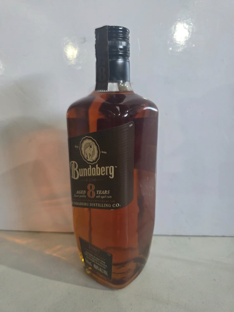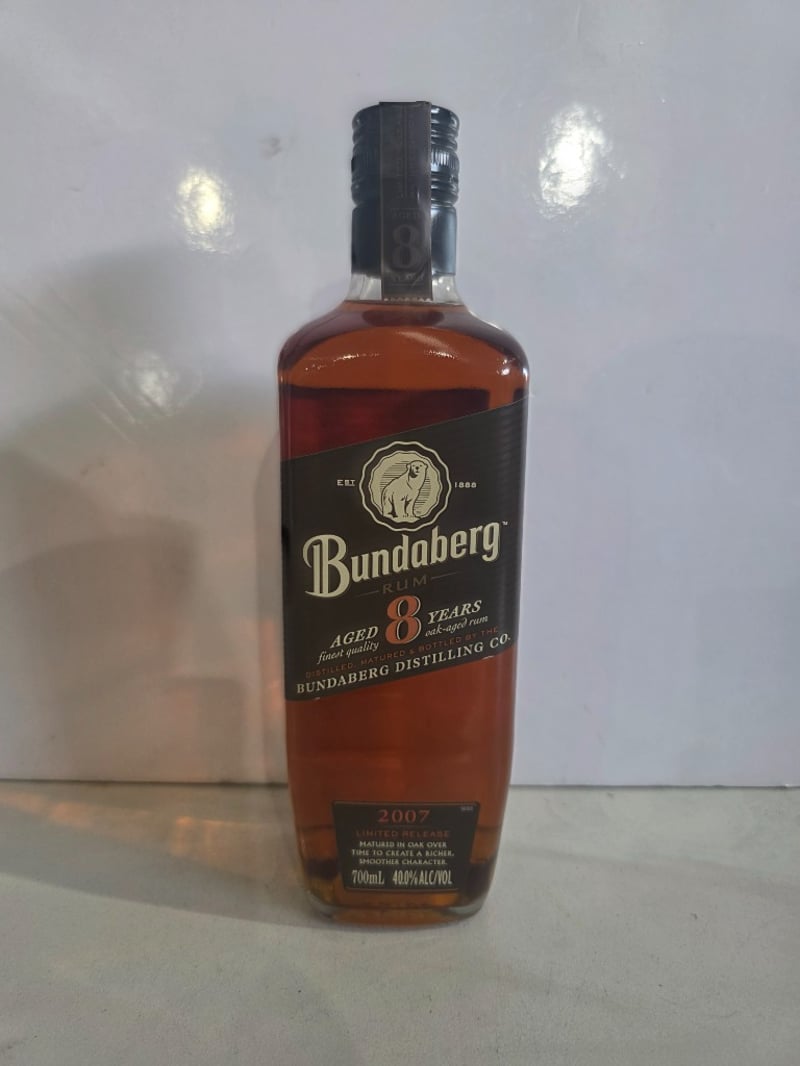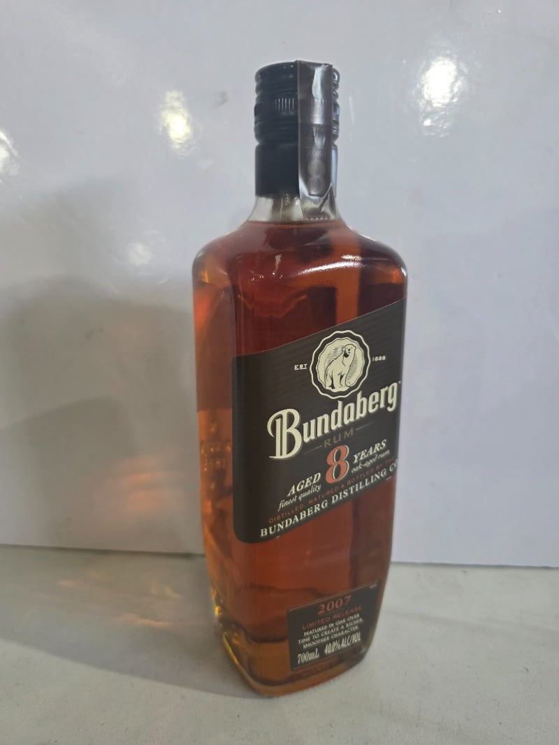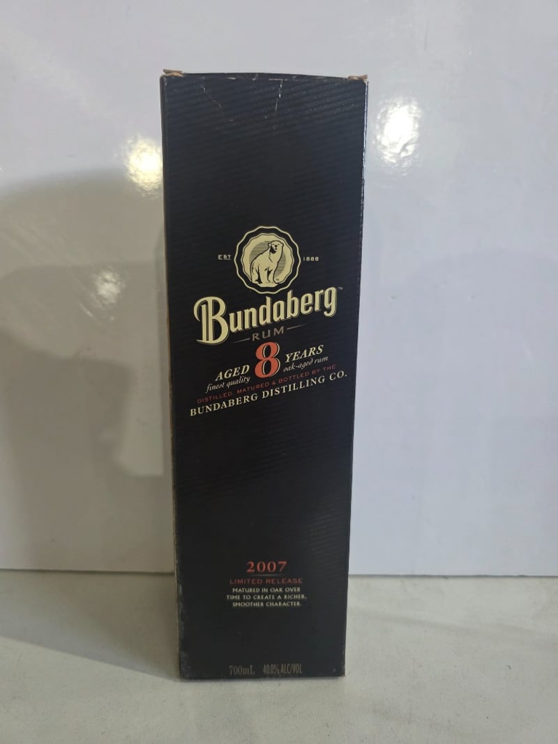Bundaberg Rum Aged 8 Years 2007 Limited Release, 700mL bottle at 40% alcohol by volume. Australian-made spirit distilled and bottled by Bundaberg Distilling Company, Whittred Street, Bundaberg, QLD 4670. This premium aged rum has been carefully crafted by the master distiller to capture the essence of rich tropical Queensland canefields. The 2007 vintage represents a limited release, matured in oak over time to create a richer, smoother character. The bottle features the iconic polar bear emblem (established 1888) on black label with gold lettering. Includes original black cardboard presentation box. Condition shows minor wear to packaging with some creasing visible. The spirit itself appears in excellent condition with rich amber-to-dark brown colouration indicating proper maturation. Suitable for collection or enjoyment.