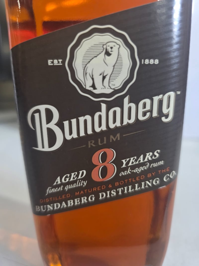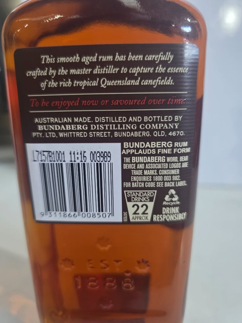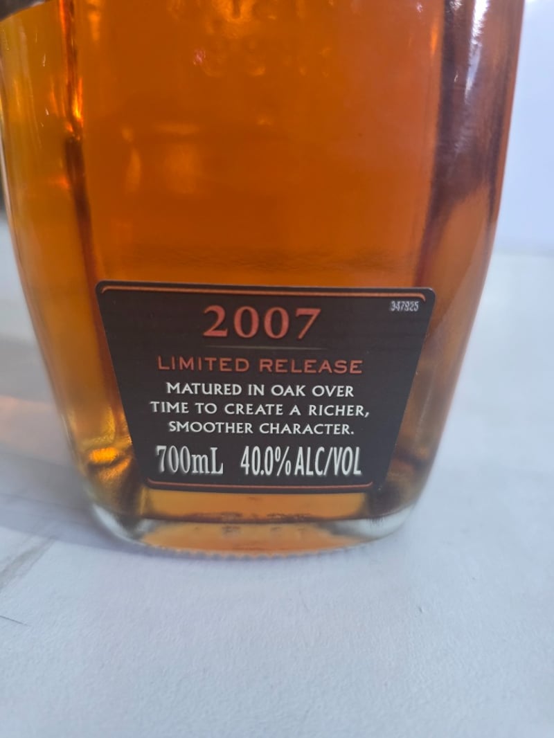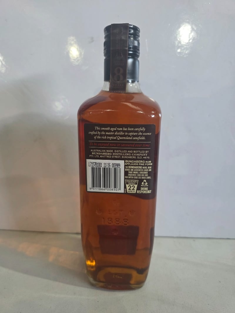 Bundaberg Rum Aged 8 Years 2007 Limited Release, 700mL bottle at 40% alcohol by volume. Australian-made spirit distilled and bottled by Bundaberg Distilling Company, Whittred Street, Bundaberg, QLD 4670. This premium aged rum has been carefully crafted by the master distiller to capture the essence of rich tropical Queensland canefields. The 2007 vintage represents a limited release, matured in oak over time to create a richer, smoother character. The bottle features the iconic polar bear emblem (established 1888) on black label with gold lettering. Includes original black cardboard presentation box. Condition shows minor wear to packaging with some creasing visible. The spirit itself appears in excellent condition with rich amber-to-dark brown colouration indicating proper maturation. Suitable for collection or enjoyment.