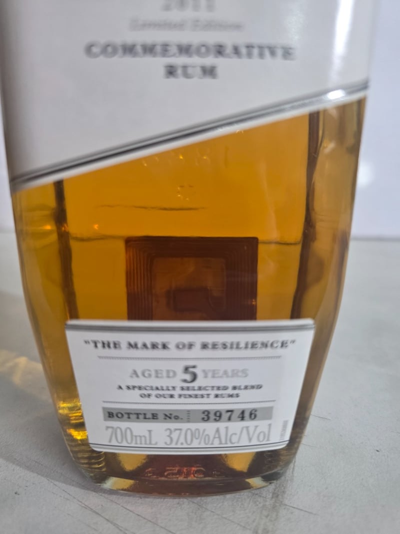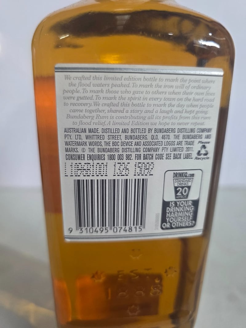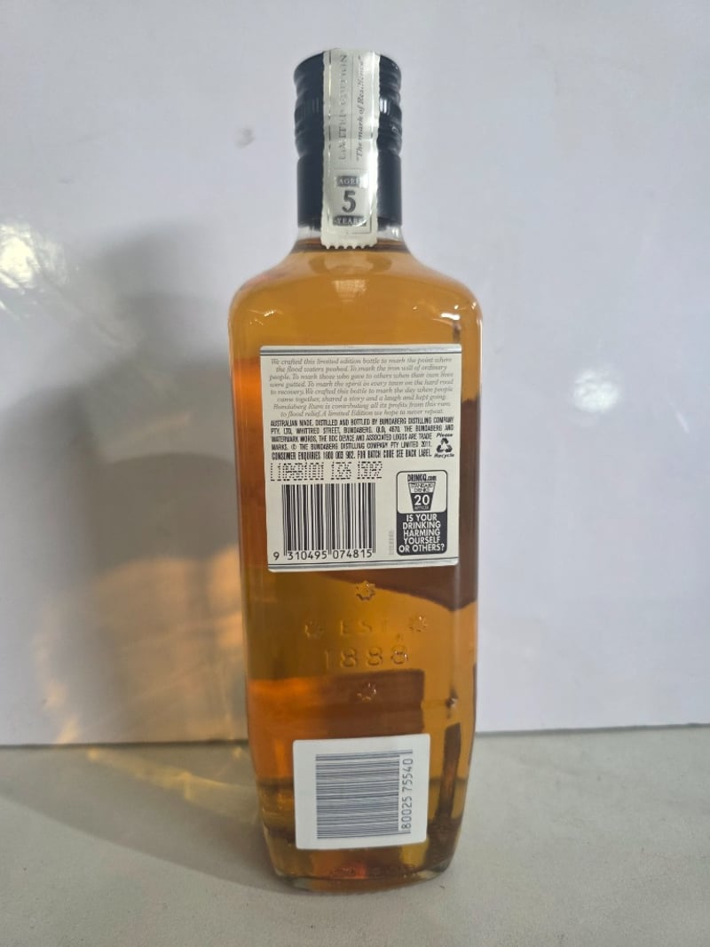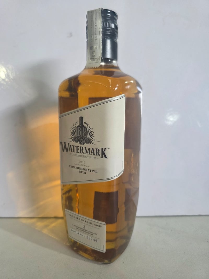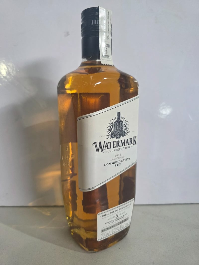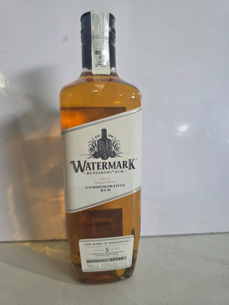 Watermark Bundaberg Rum 2011 Limited Edition Commemorative Rum, "The Mark of Resilience" aged 5 years. A specially selected blend of finest rums bottled by Bundaberg Distilling Company, Whittred Street, Bundaberg, QLD 4670. This commemorative release marks the point where flood waters peaked, honouring the resilience of ordinary people and communities affected by natural disaster. The bottle features the iconic Watermark branding with embossed details and includes narrative text describing the spirit's purpose in supporting flood relief efforts. 700ml bottle at 37.0% alcohol by volume. Bottle number 39746. Australian made and distilled. Profits from this limited edition release contributed to flood relief initiatives. The bottle presents in good condition with original labelling intact and liquid level appropriate for age.