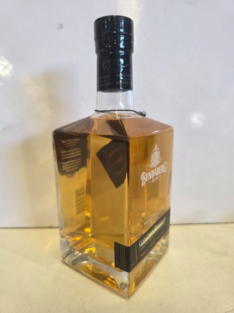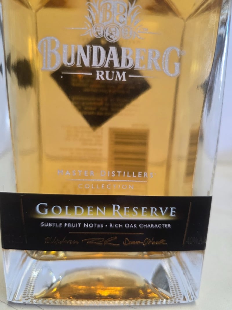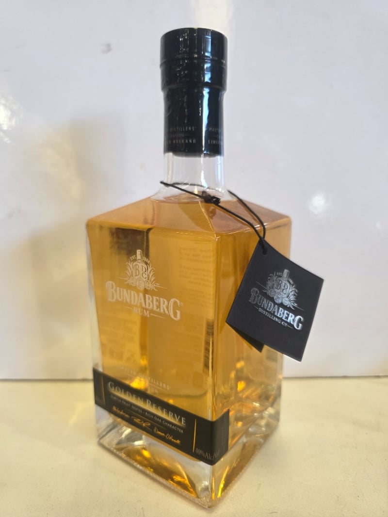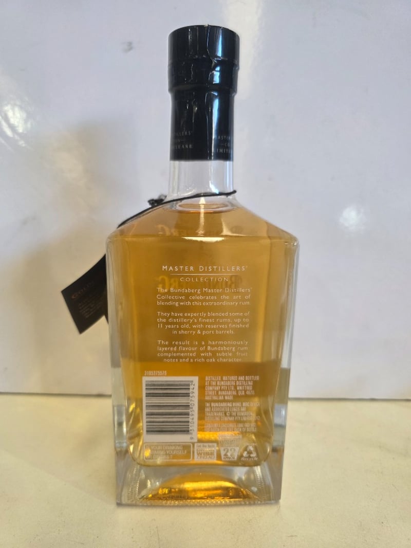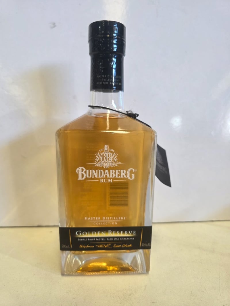 Bundaberg Rum Master Distillers' Collection Golden Reserve. This premium Australian rum represents the distillery's finest blending artistry, featuring rums aged up to 11 years in sherry and port barrels. The Golden Reserve exhibits subtle fruit notes complemented by rich oak character, delivering a harmoniously layered flavour profile. Presented in a distinctive square glass bottle with black capsule seal and branded hang tag. The Master Distillers' Collection label indicates this is a curated expression showcasing exceptional blending craftsmanship. 40% ABV. Unopened with original packaging intact.