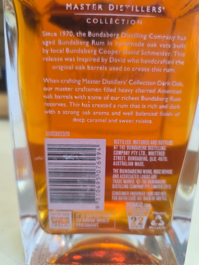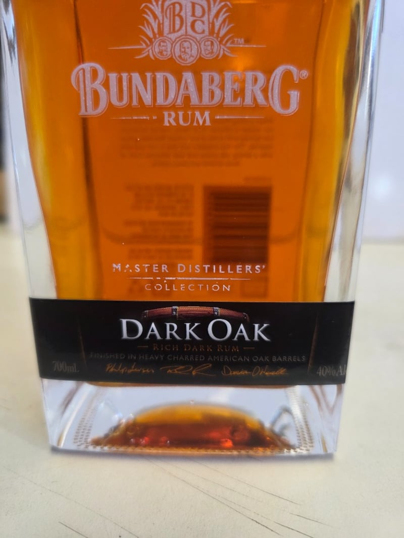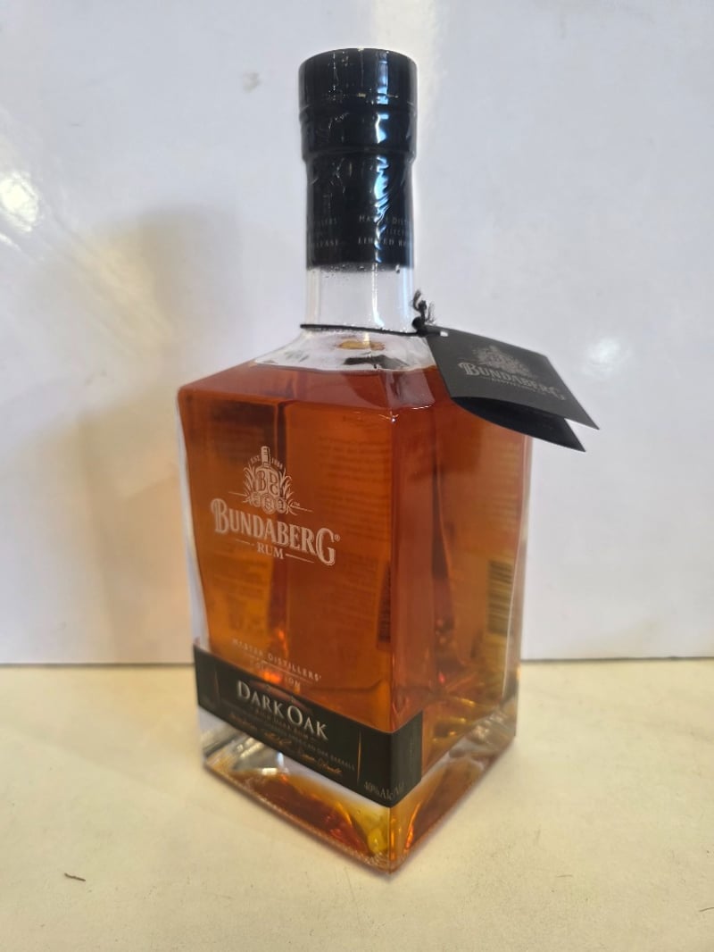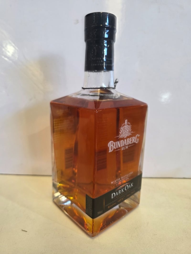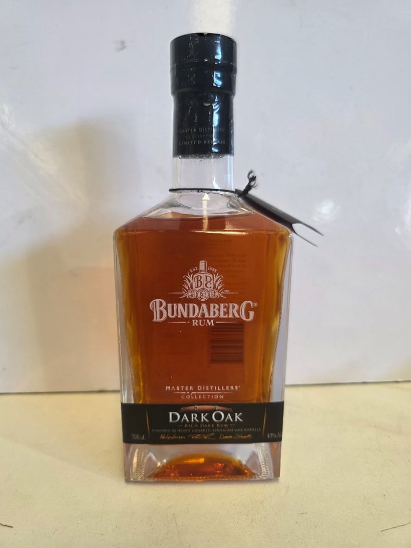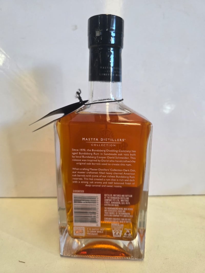 Bundaberg Rum Master Distillers' Collection Dark Oak, 700ml bottle, 40% ABV. This premium Australian rum from the Bundaberg Distilling Company features rum aged in handmade oak vats and finished in heavy charred American oak barrels. The expression showcases rich, dark characteristics with pronounced oak aromatics, balanced with notes of deep caramel and sweet raisins. Part of the Master Distillers' Collection, this release was inspired by local Bundaberg Cooper David Schneider who handcrafted the original oak barrels. The bottle presents in excellent condition with intact black capsule seal, clear labelling, and full liquid level. Batch code visible on label. Distilled, matured and bottled at the Bundaberg Distilling Company Pty Ltd, Whittred Street, Bundaberg, QLD 4670, Australia.