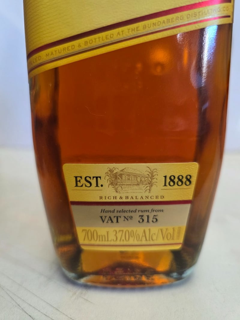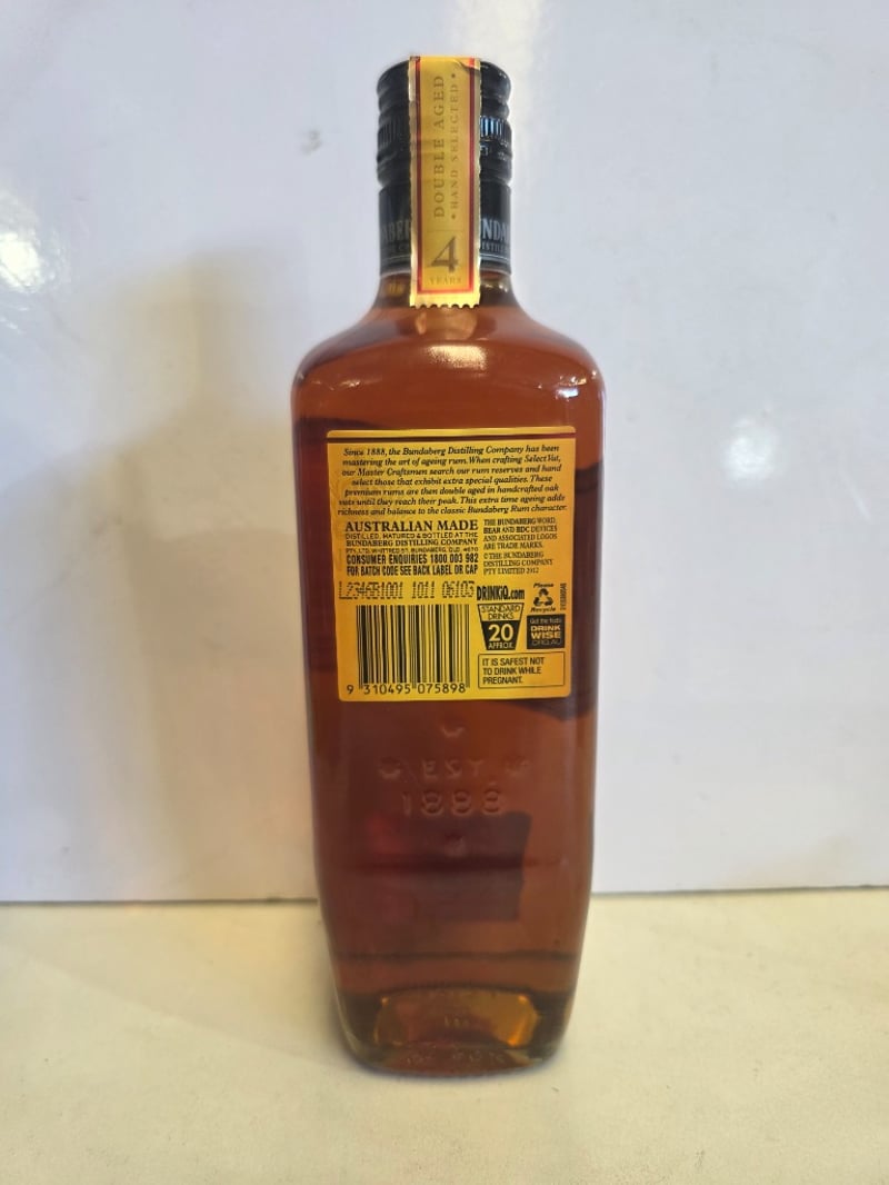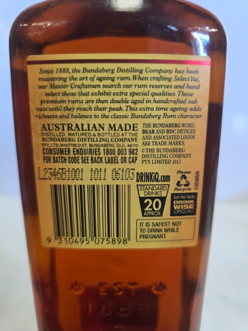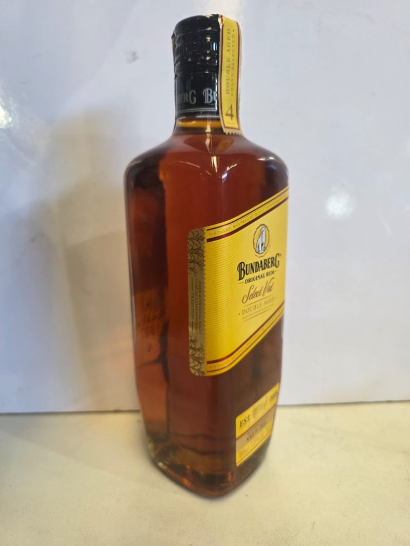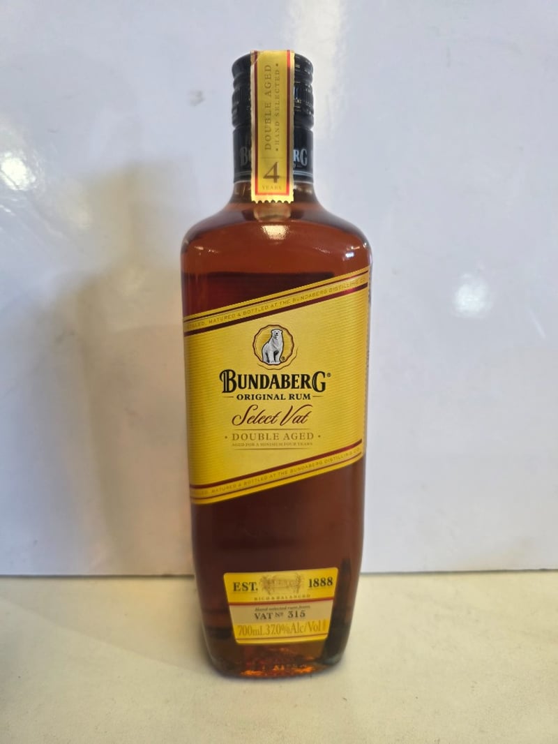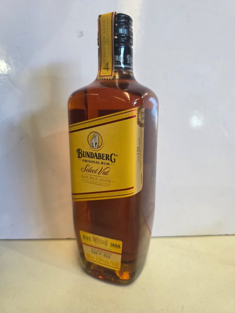 Bundaberg Select Vat Original Rum, Double Aged, 700ml bottle at 37.0% alcohol by volume. Hand-selected rum from VAT No. 315, established 1888. Premium Australian-made spirit double aged in handcrafted oak vats until peak maturity. Presented in original brown glass bottle with yellow and black label featuring the Bundaberg bear emblem. Accompanied by a vintage tan leather presentation case with brass hardware and stitched detailing, lined with dark velvet interior. The case features two leather carrying handles and metal clasp closure. Condition reflects age and use but remains functional and presentable. Ideal for collectors of premium Australian spirits and vintage presentation cases.