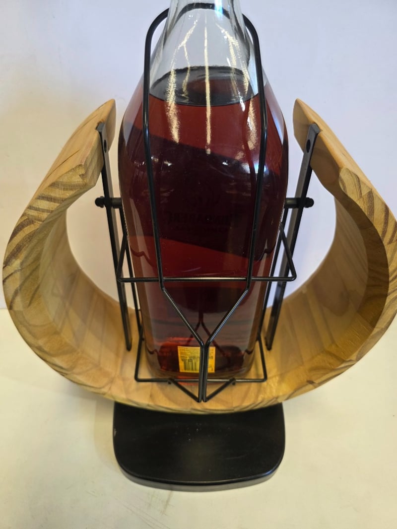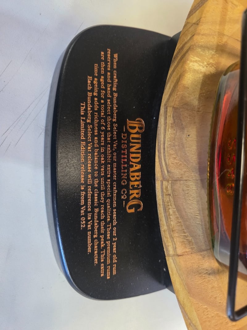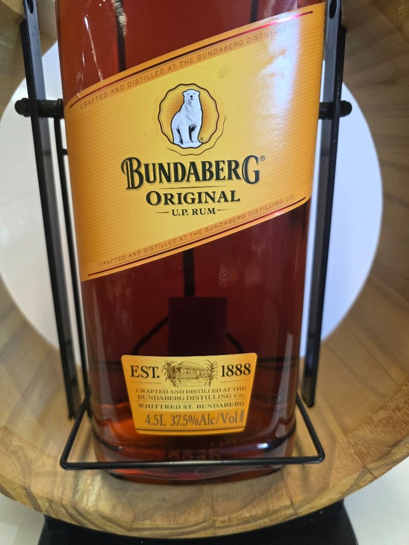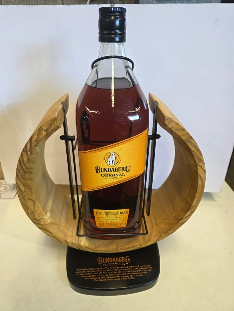 Bundaberg Original U.P. Rum 4.5L presentation bottle, established 1888, crafted and distilled at the Bundaberg Distillery, Whittred Street, Bundaberg. 37.5% alcohol by volume. The bottle features a distinctive wooden cradle display stand with curved wooden arms and black metal framework, creating an elegant presentation piece. The rum displays a rich amber-brown colour characteristic of the Original blend. The bottle includes the iconic Bundaberg polar bear logo on the yellow label. This is a premium collectible display piece, ideal for rum enthusiasts and decorative purposes. The wooden stand enhances the visual appeal and provides stable support for the large-format bottle.