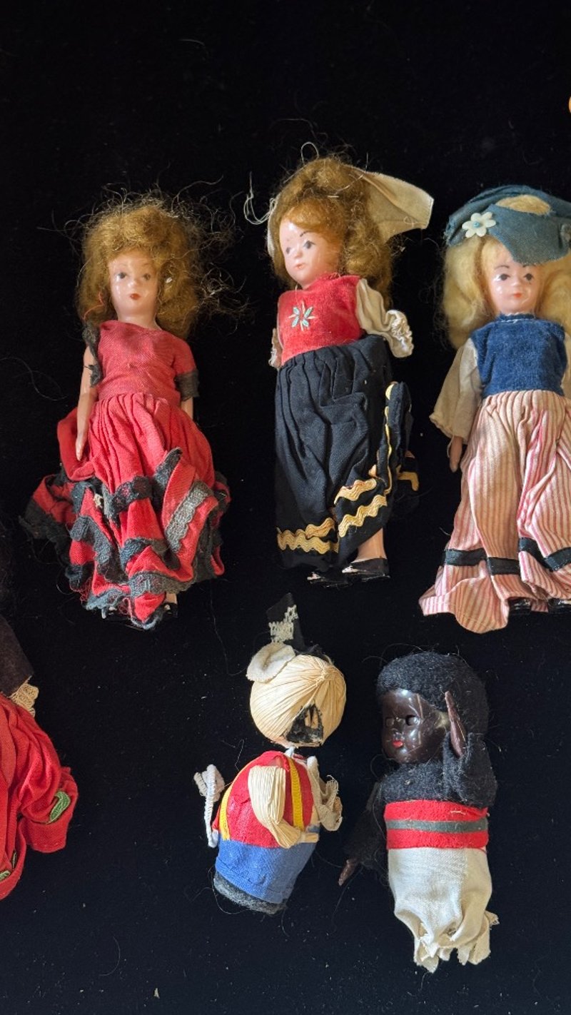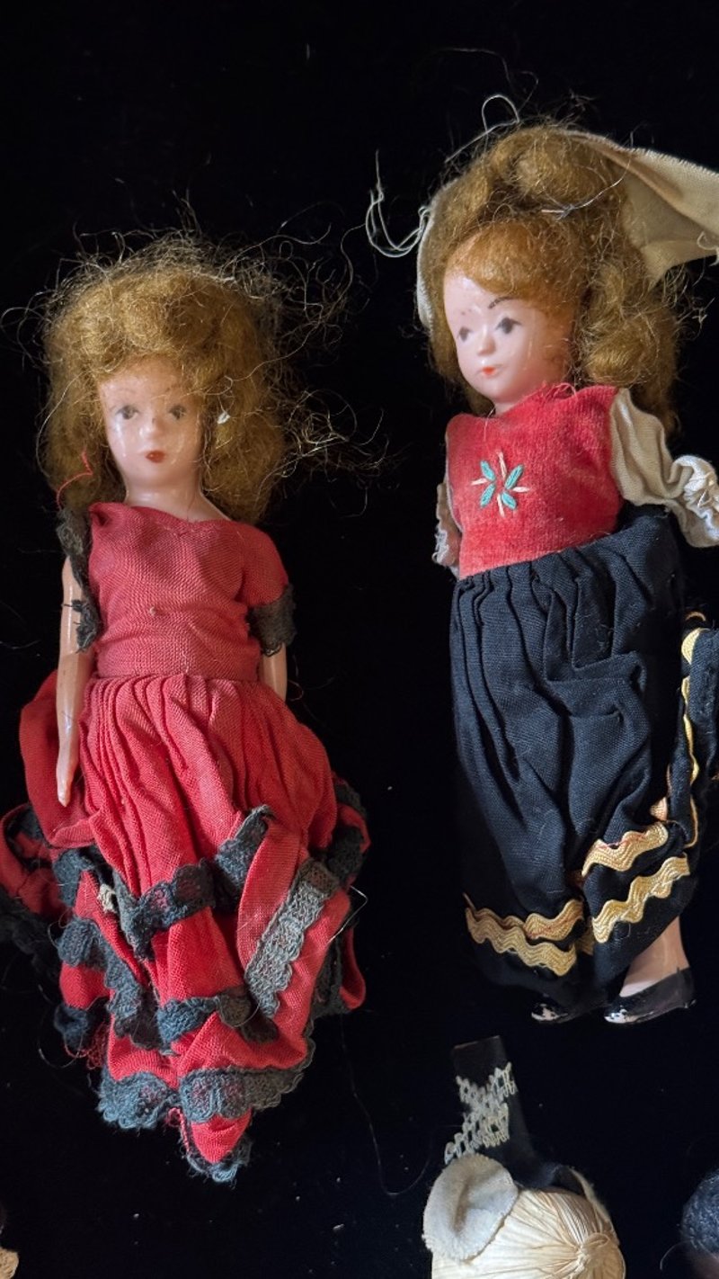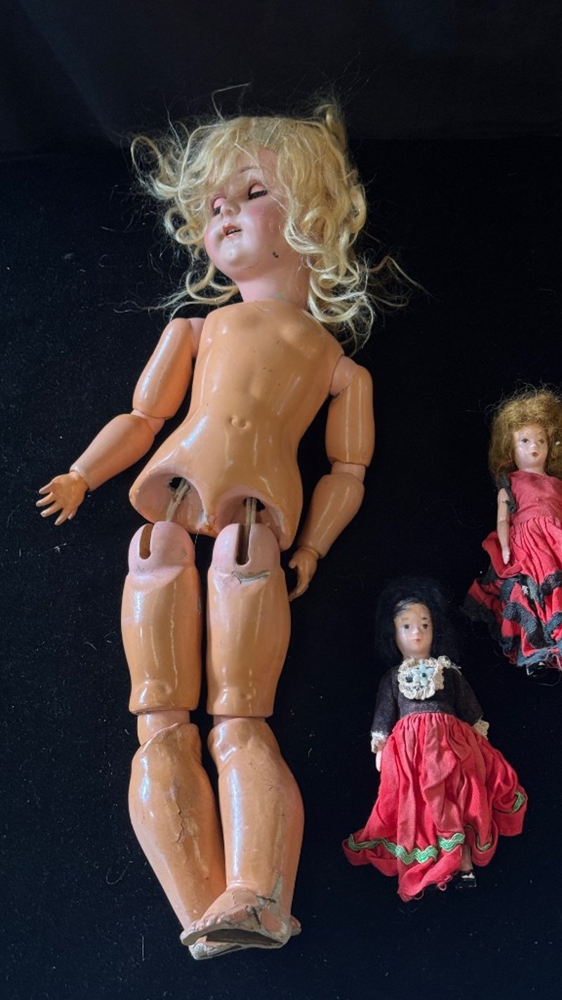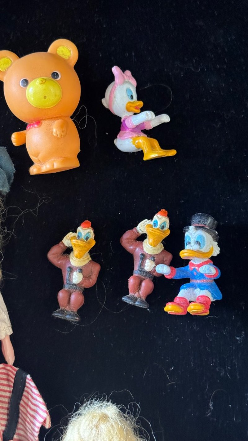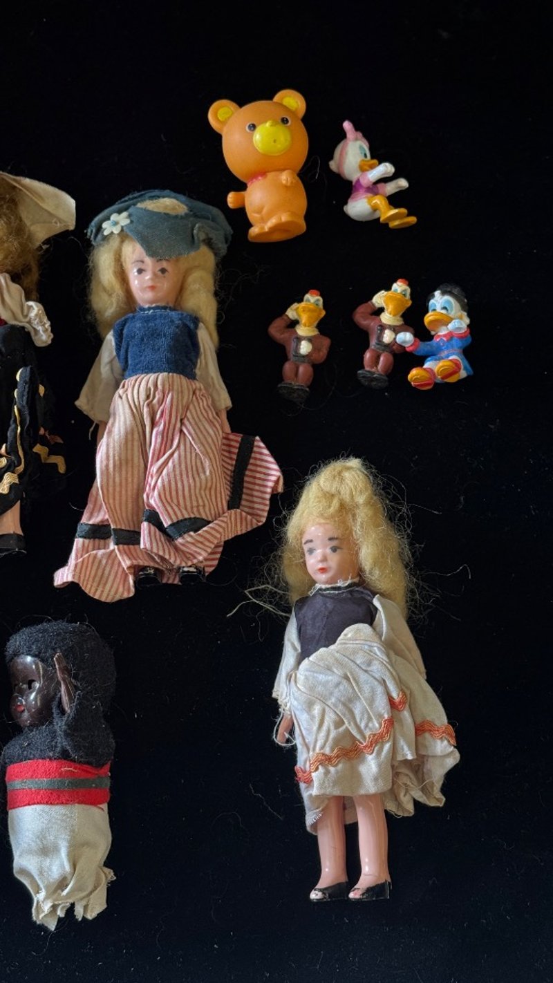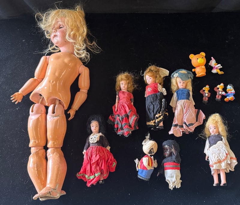 Comprehensive Vintage Doll Collection Featuring A Large Articulated Composition Figure With Blonde Curled Hair And Jointed Limbs, Accompanied By Approximately 15 Smaller Dressed Dolls In Period Costumes With Fabric Skirts And Bonnets, Plus Miniature Plastic Toys Including Bears, Ducks, And Character Figures. Mixed Materials Including Composition, Fabric, And Plastic Components.