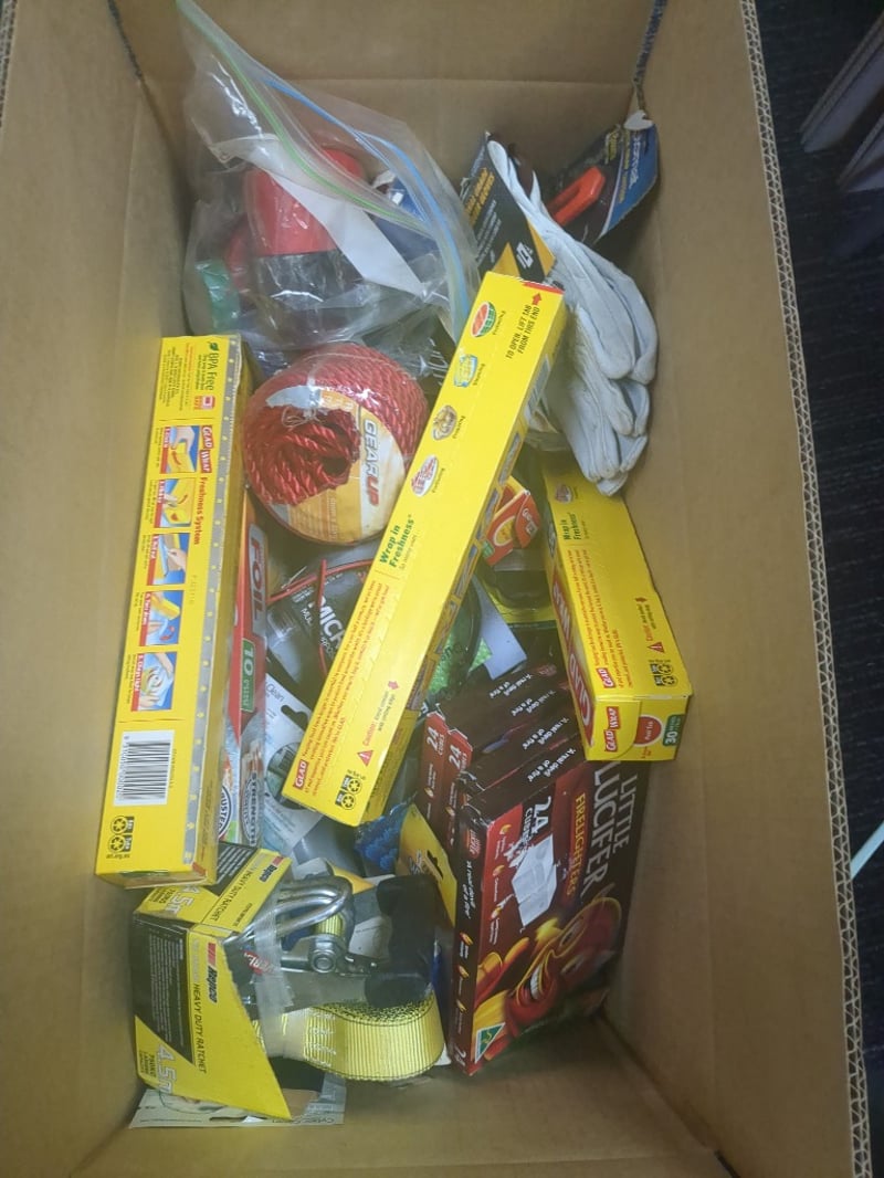 Box Of Assorted Service Station Goods Including Fire Lighters, Microfiber Cloths, Gloves, Rope And More.