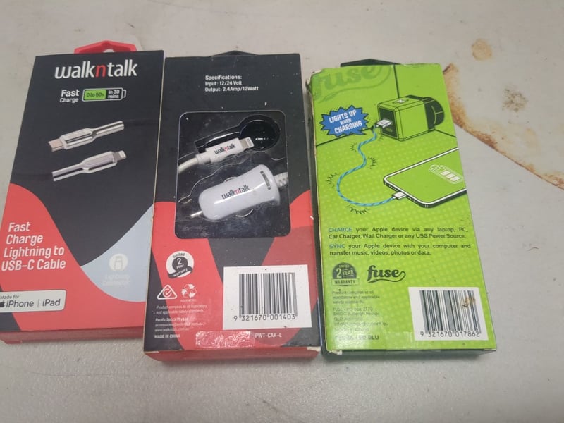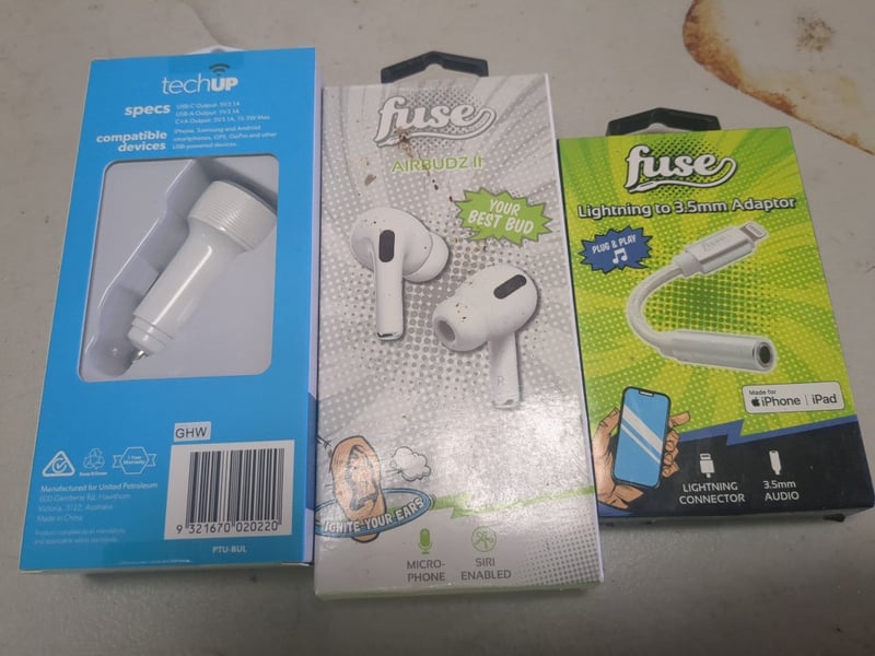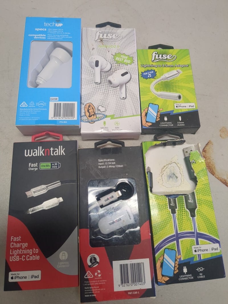 Assorted Phone Accessories Including Fuze Airbudz 2, Fast Charge Lightening to USB C Cable And More. Sold As Lot