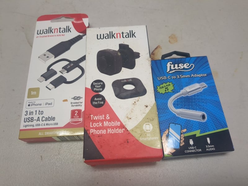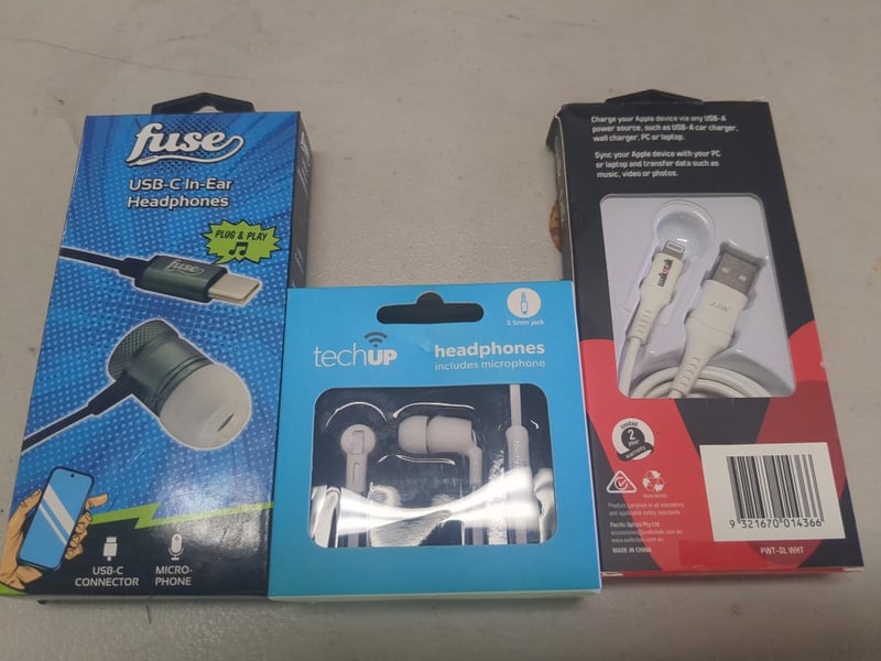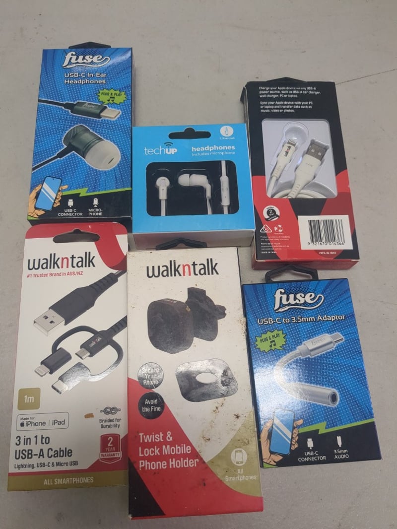 Assorted Phone Accessories Including USB C In-Ear Headphones, Twist And Lock Mobile Phone Holder And More.