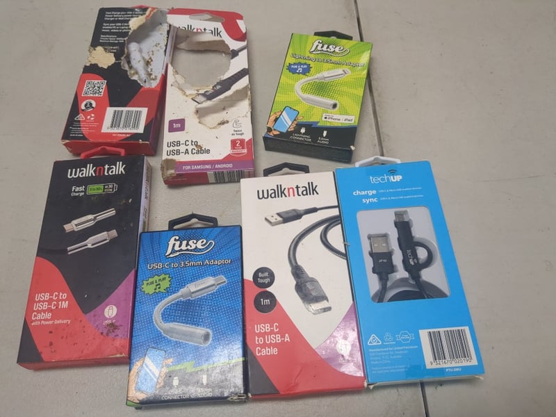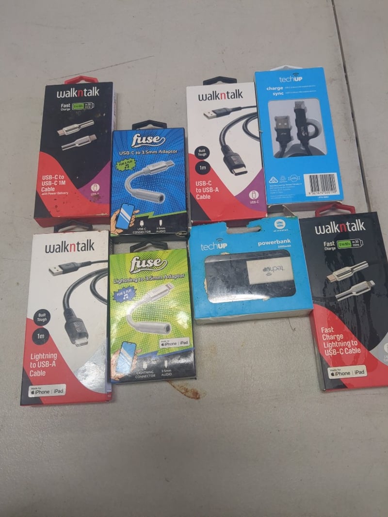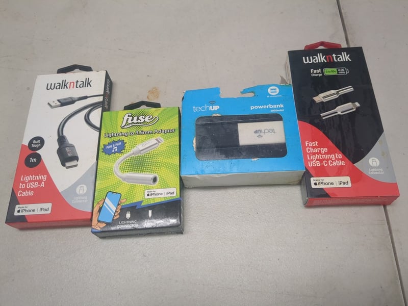 Assorted Phone Accessories Including TechUp PowerBank, Lightening to USB-A Cable And More. Sold As Lot