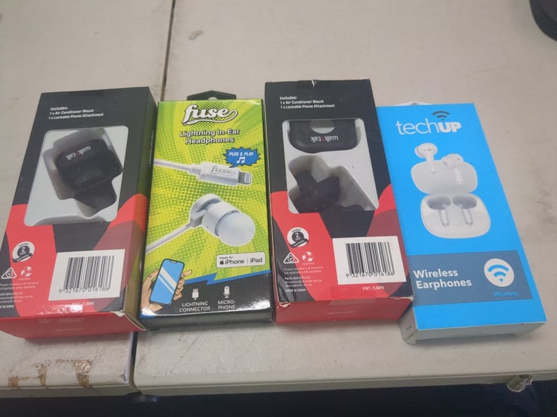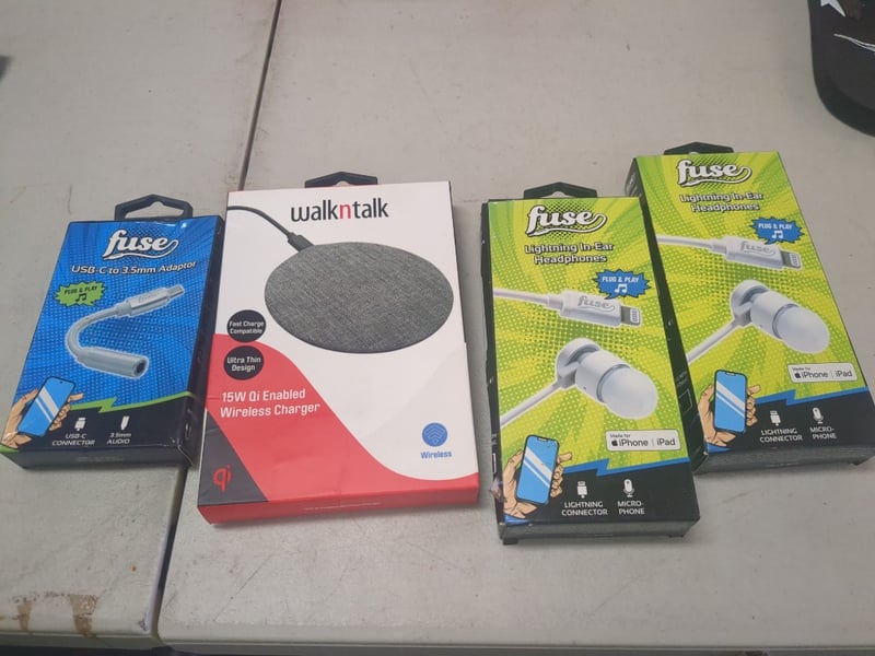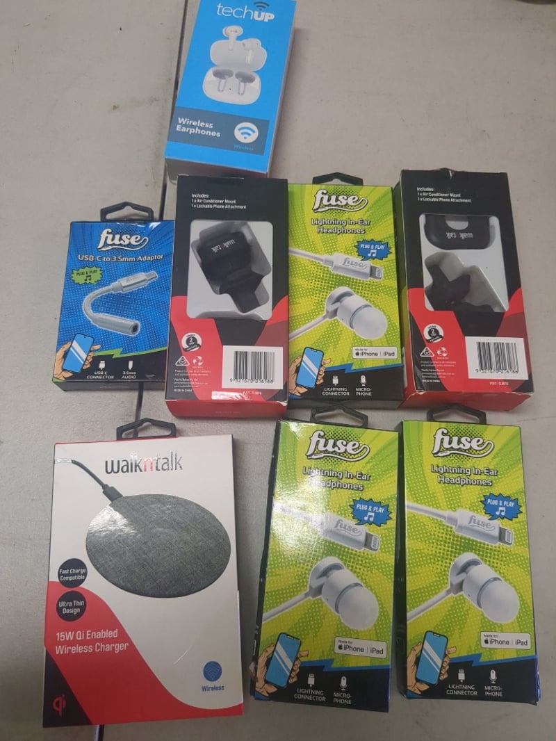 Assorted Phone Accessories Including Tech Up Wireless Earphones, 15W Qi Enabled Charger And More. Sold As Lot