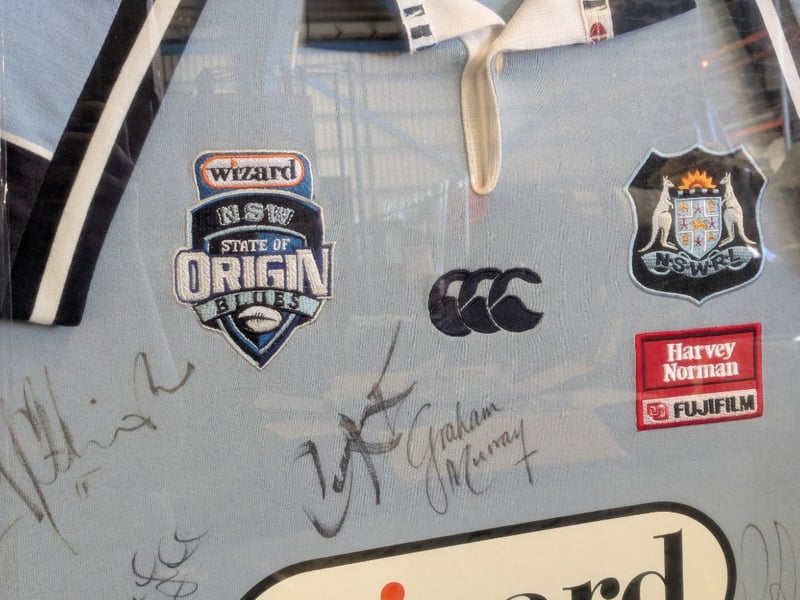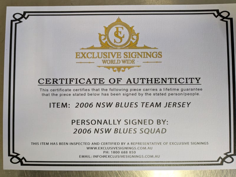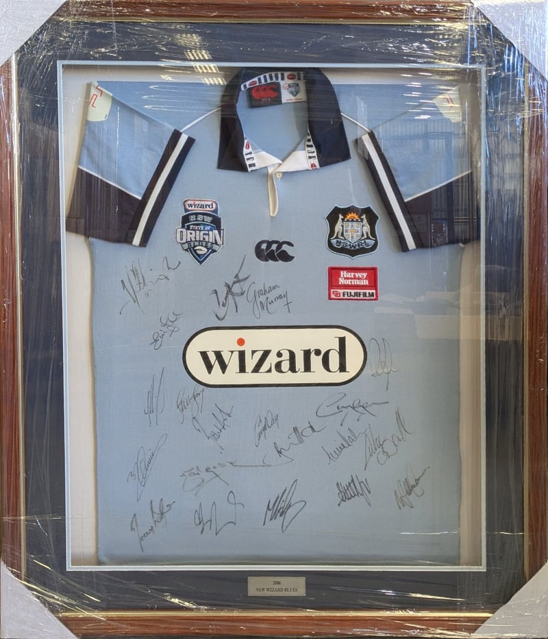 2006 NSW BLUES STATE OF ORIGIN TEAM SIGNED JERSEY IN FRAME Item Size: Height: 84cm, Width: 98cm, Depth: 3cm Includes Certificate Of Authenticity Condition: Good - Refer To Images 584483+27