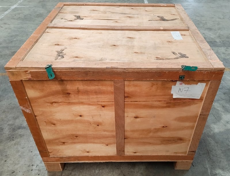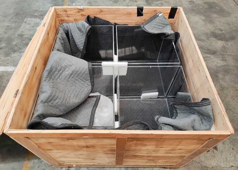 Clear square storage containers and blankets in crate.