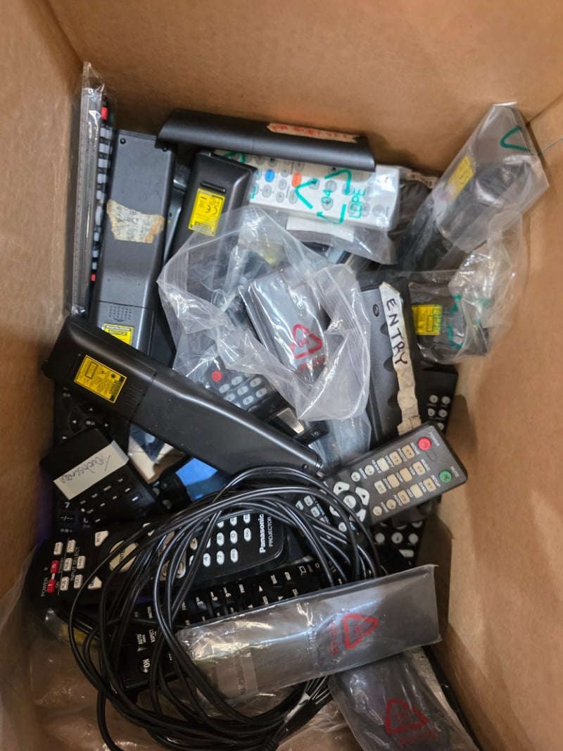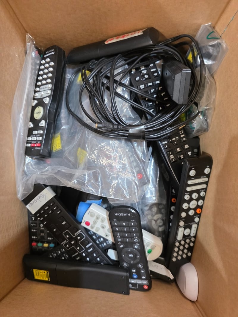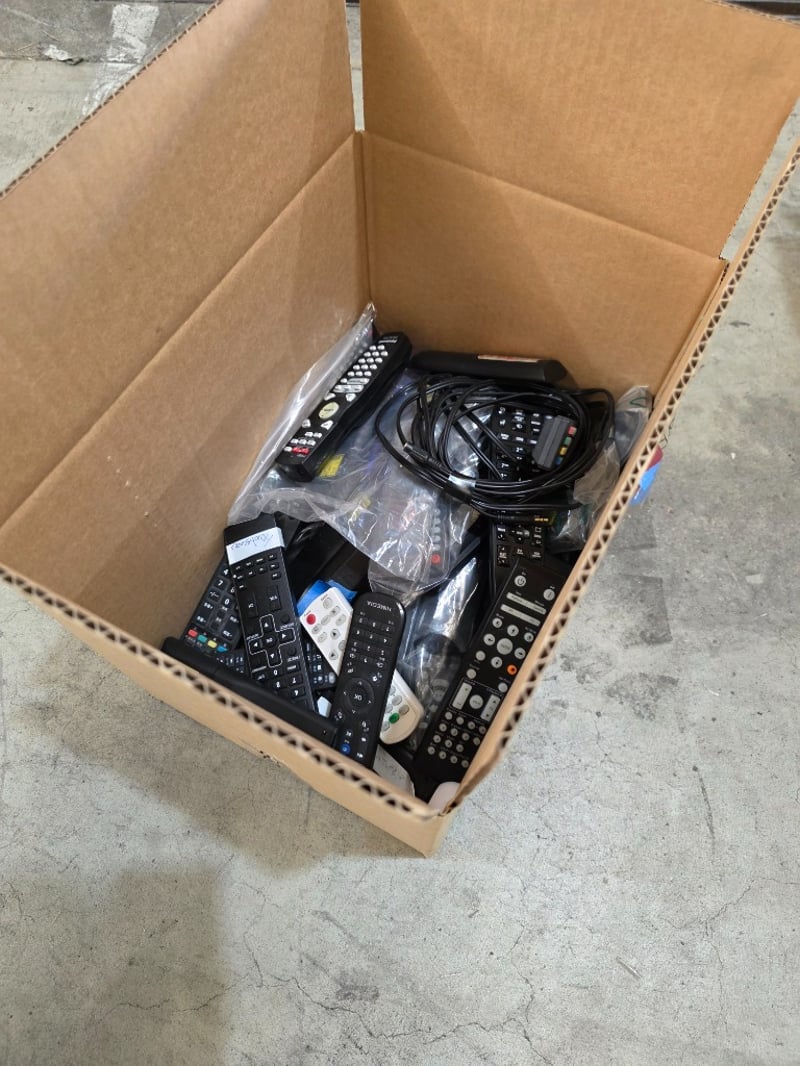Bulk lot of remote controls including multiple universal remotes, TV remotes, and audio/video equipment controllers. Assorted black remotes with various button configurations, some with illuminated keypads. Collection includes approximately 8-10 remotes in various conditions, some still in original packaging. Mixed lot appears to include remotes for televisions, set-top boxes, and entertainment systems. Cables and connectors included. Lot sold as-is, untested.