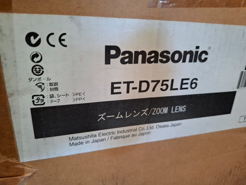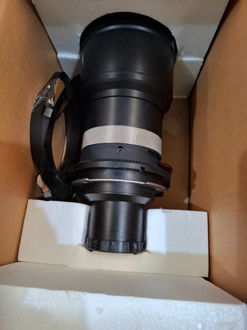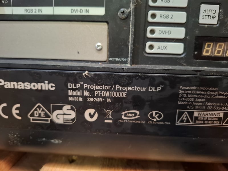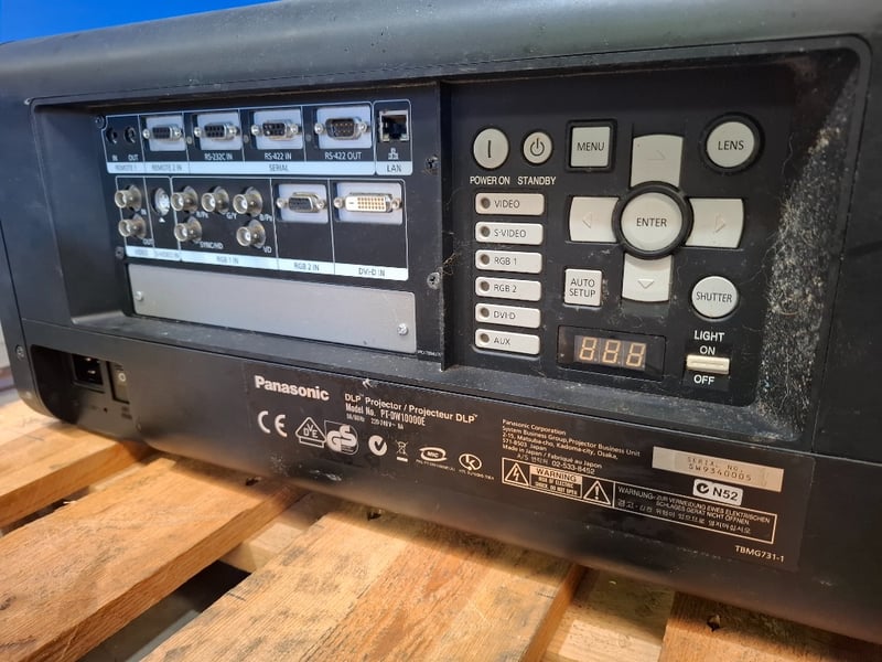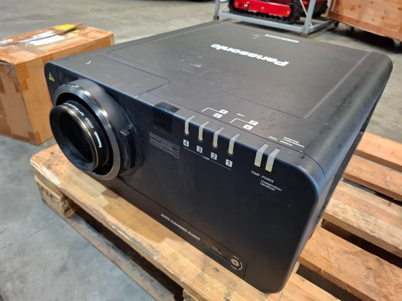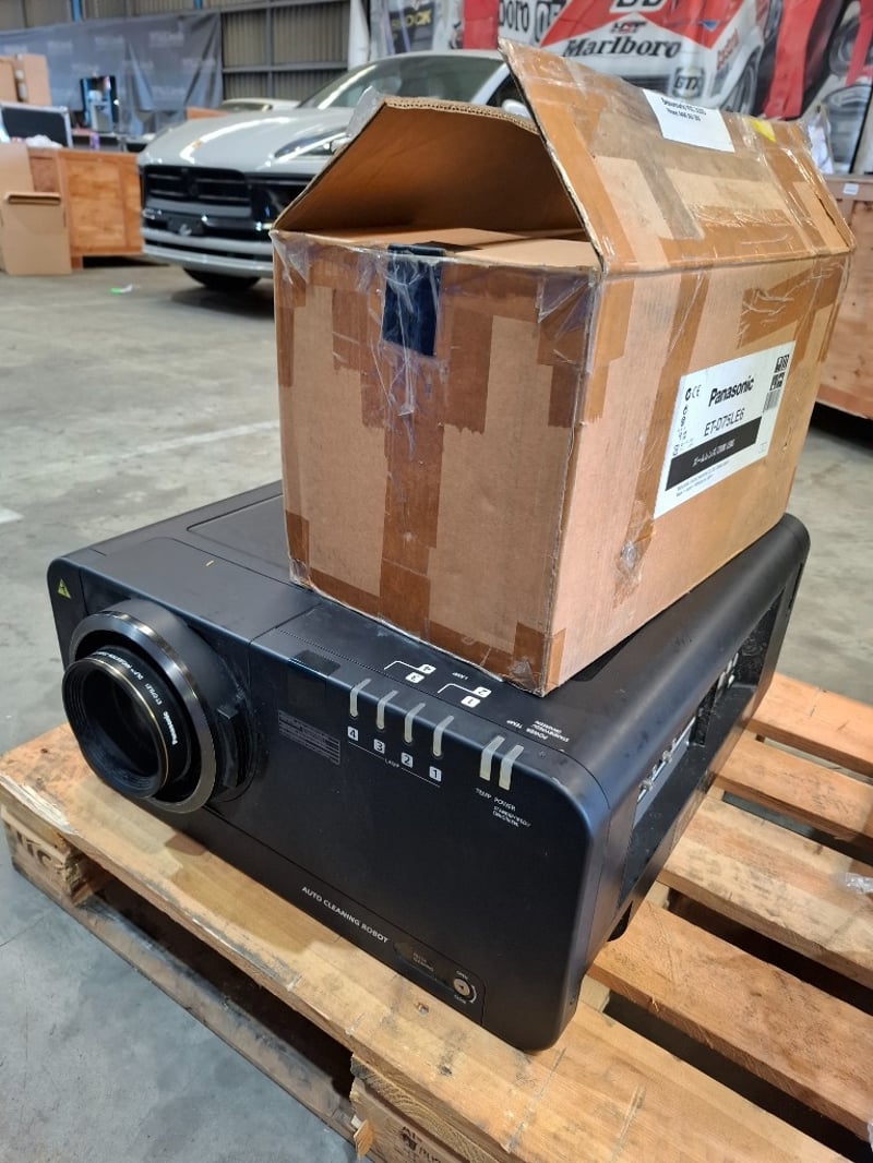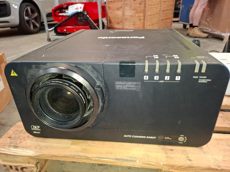 Professional Panasonic DLP projector system comprising model PT-DW10000E with ET-D75LE6 zoom lens and auto-cleaning robot. The projector features DLP technology with multiple input options (RGB, DVI-D, video, S-video, AUX connectors) and manual lens controls. Includes automated lens cleaning mechanism to maintain optical clarity. This is a high-specification theatrical/venue projection system designed for large-scale installations. The unit shows signs of previous use and storage. Accessories include the precision zoom lens with focus and iris adjustment capabilities. Original packaging partially intact.