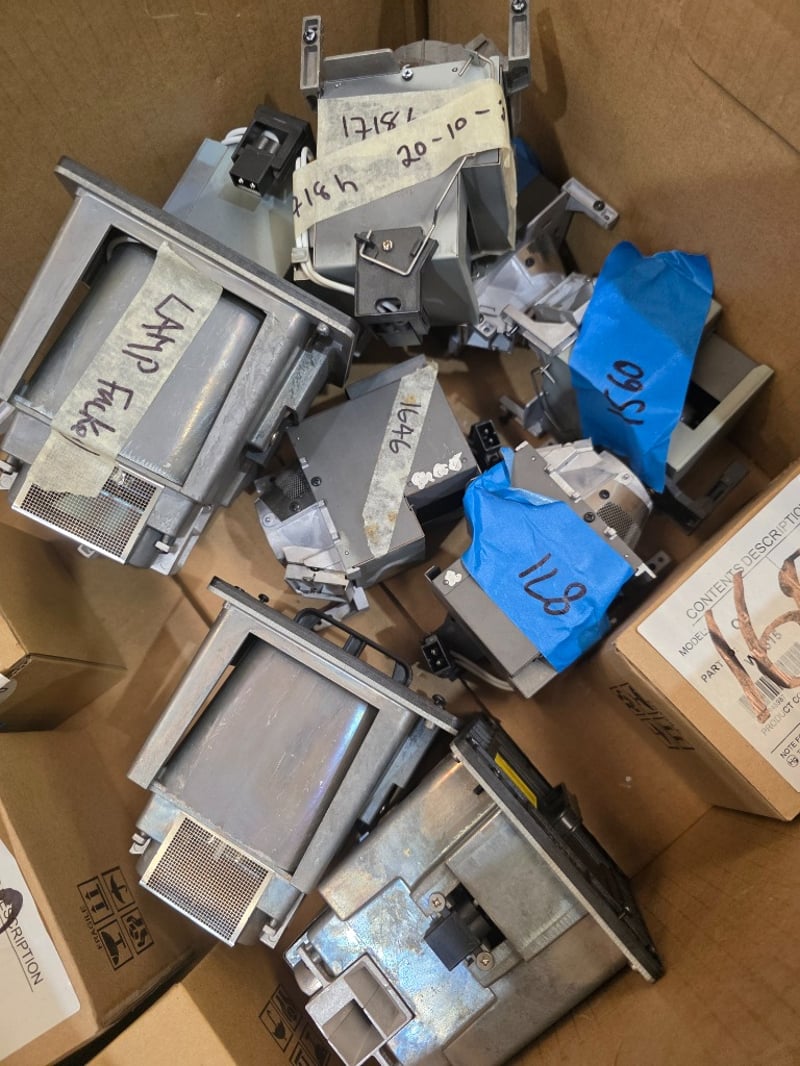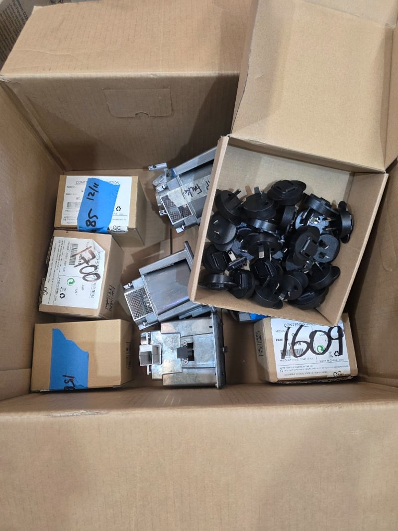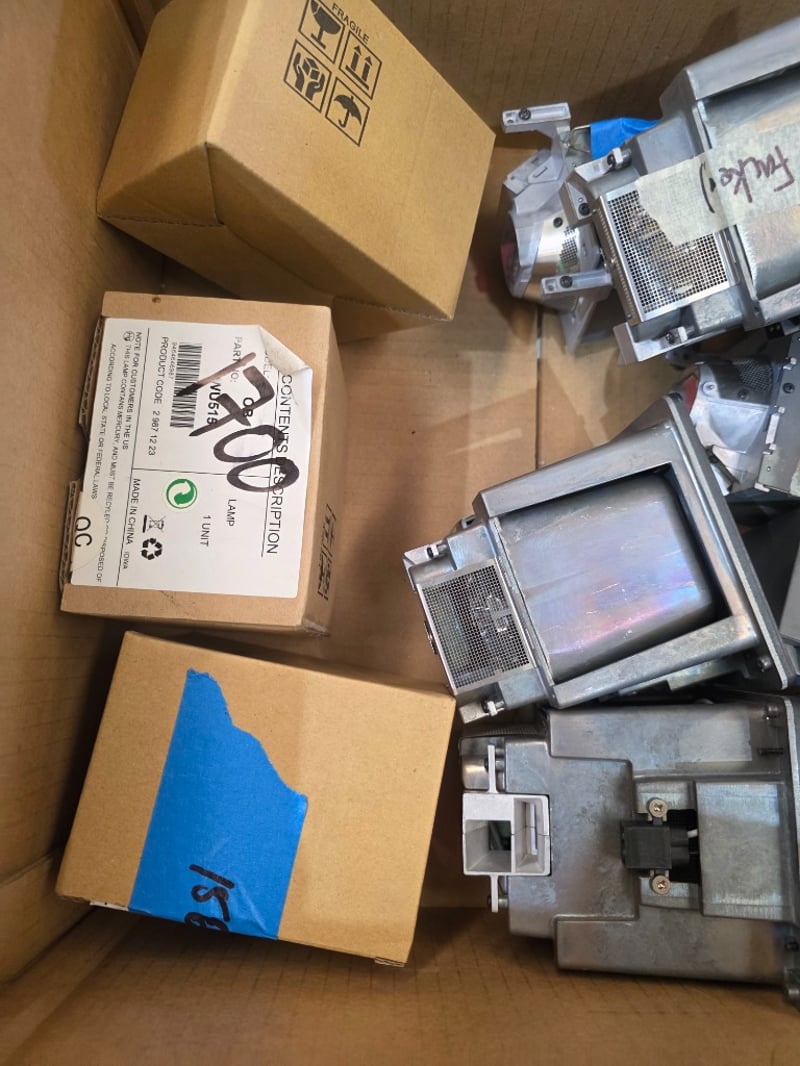 Bulk lot of projector components and spare parts including multiple lamp/lens assemblies with metal housings, numerous black plastic lens caps and protective covers, metal mounting brackets, internal optical components, and various cardboard boxes containing additional parts. The lot appears to be surplus projector equipment and components suitable for repair, refurbishment or parts harvesting. Includes both optical elements and mechanical mounting hardware. Mixed condition with some visible wear and dust accumulation on metal components.