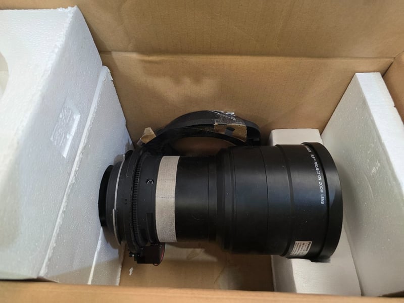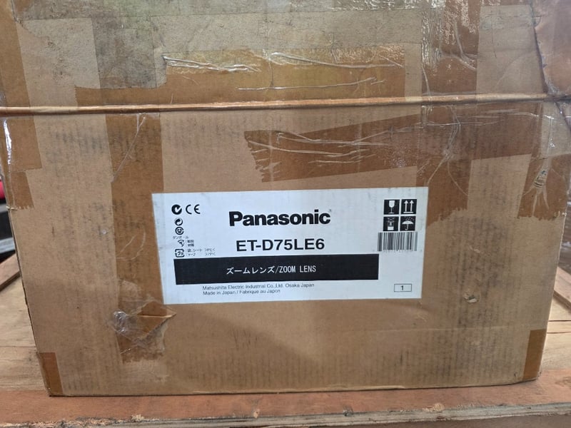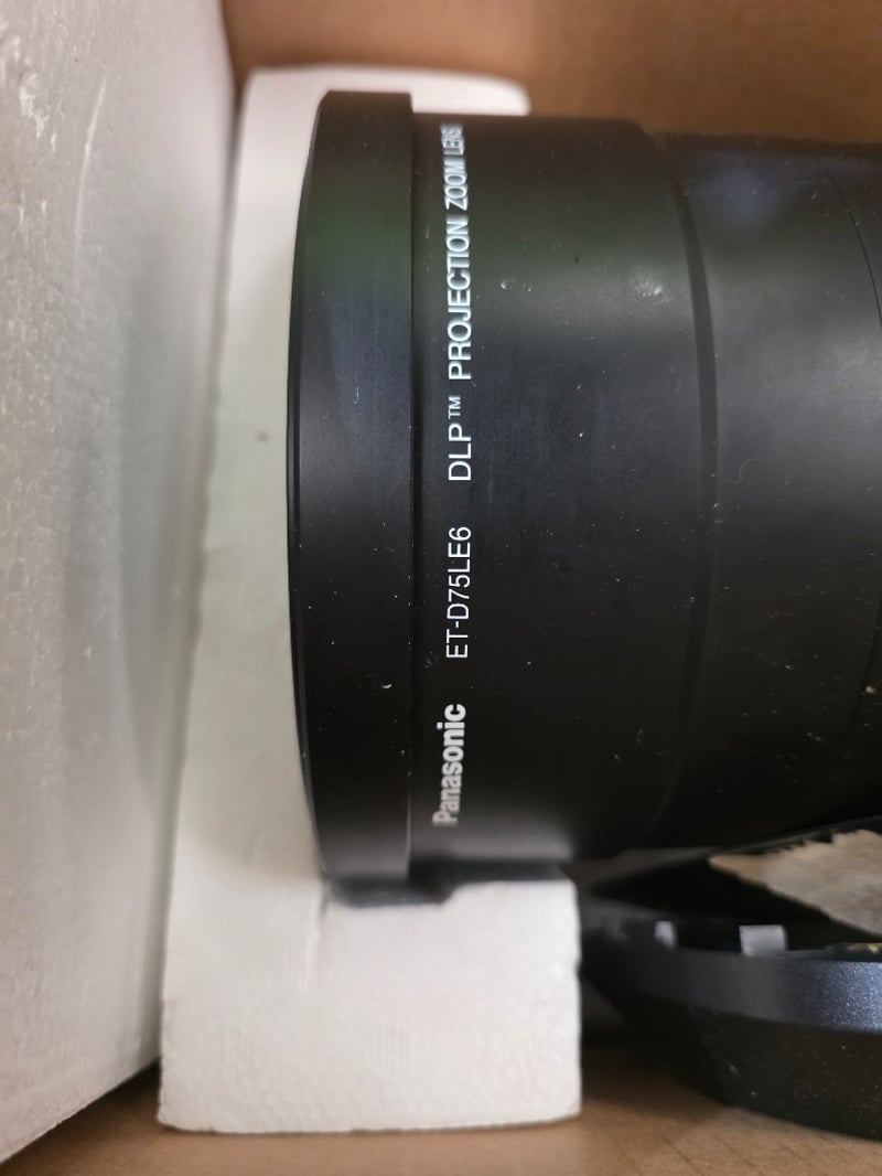 Panasonic ET-D75LE6 DLP projection zoom lens for professional projector applications. This is a high-quality optical component designed for precision image projection. The lens features motorized zoom capability and is housed in robust black metal construction with protective tape applied. Includes original packaging with foam inserts for safe transport and storage. The lens barrel displays the model designation and DLP projection zoom lens specifications. This appears to be an unused or lightly used professional-grade optical component, ideal for theatre, presentation, or large-venue display systems. Made in Japan by Matsushita Electric Industrial Co., Ltd.