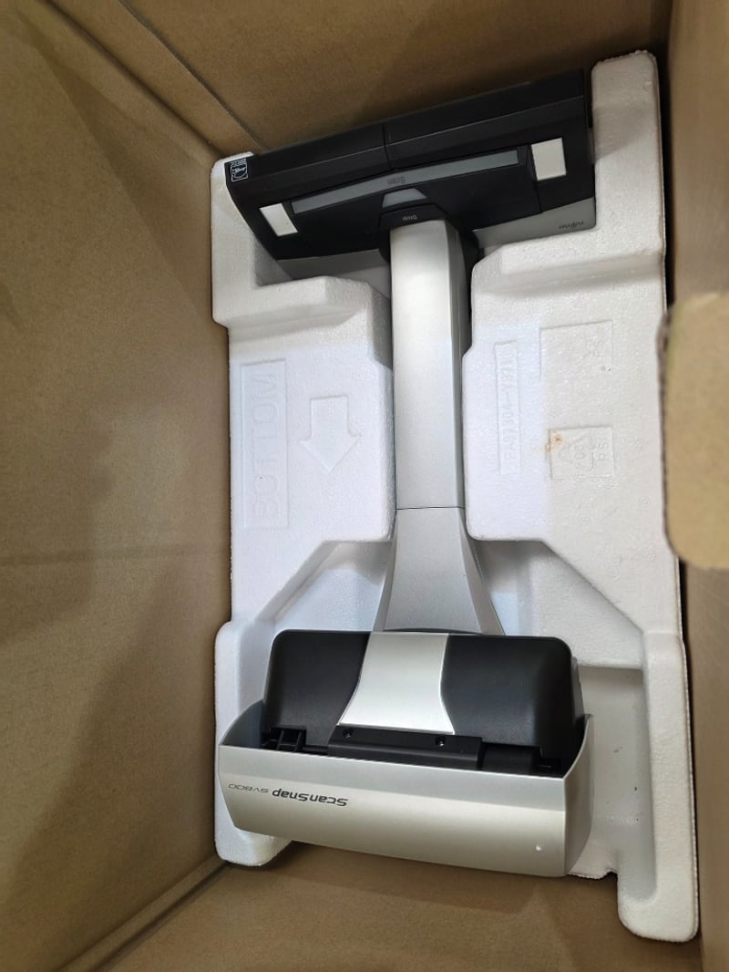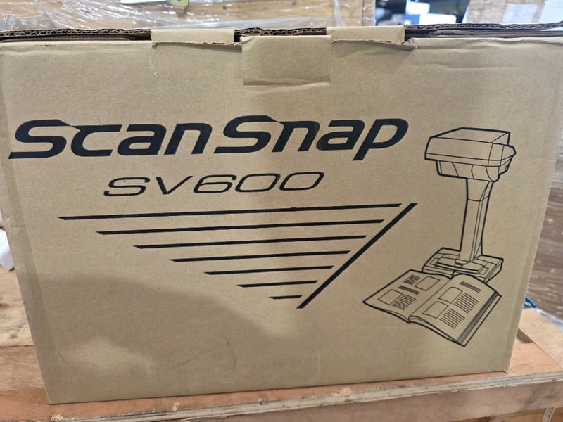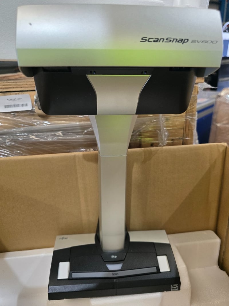 Fujitsu ScanSnap SV600 overhead document scanner. This professional-grade scanning system features a distinctive overhead design with articulated arm and base platform. The scanner head is mounted on a motorized vertical stand, allowing documents to be placed on the flat bed below for capture. Includes the black scanning head unit with white/lime-green accents and the matching base station. The system is designed for high-volume document digitization, offering automatic feed capability and optical character recognition (OCR) functionality. Original packaging visible with product branding. Appears complete with all main components present. Ideal for office, library, or archival applications requiring efficient batch scanning of various document types. Working condition unknown