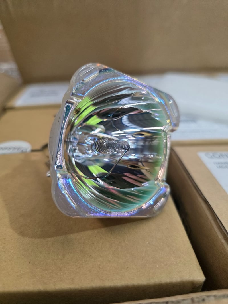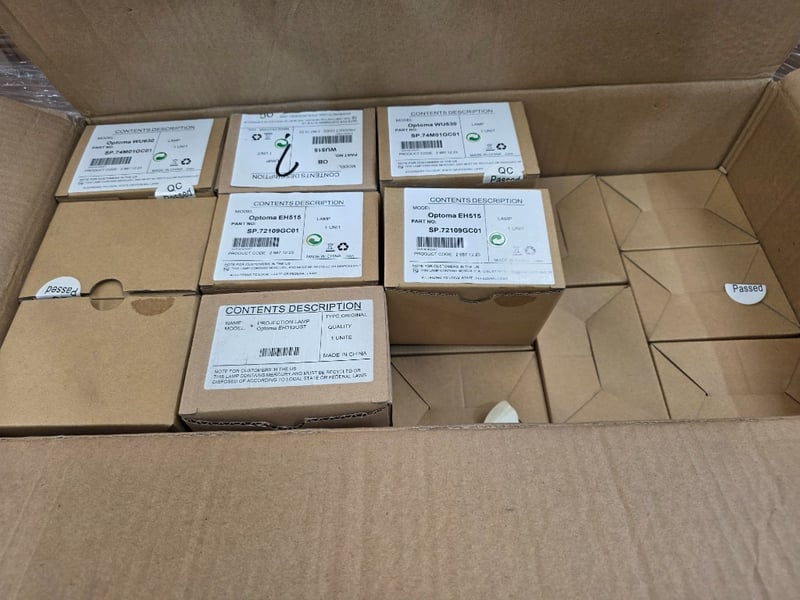 Bulk lot of projector lamps and optical components. Includes multiple Optoma replacement lamp units (models EH615, WU630, WU636 visible) with original packaging and contents description labels. One bare lamp assembly shown separately featuring precision glass optics with multi-element lens configuration and threaded mounting hardware. All units appear factory-sealed in cardboard packaging with QC inspection stickers marked "Passed." Yellow protective shipping carton visible. Suitable for theatre, presentation, or industrial projection applications. Mixed inventory lot as pictured.