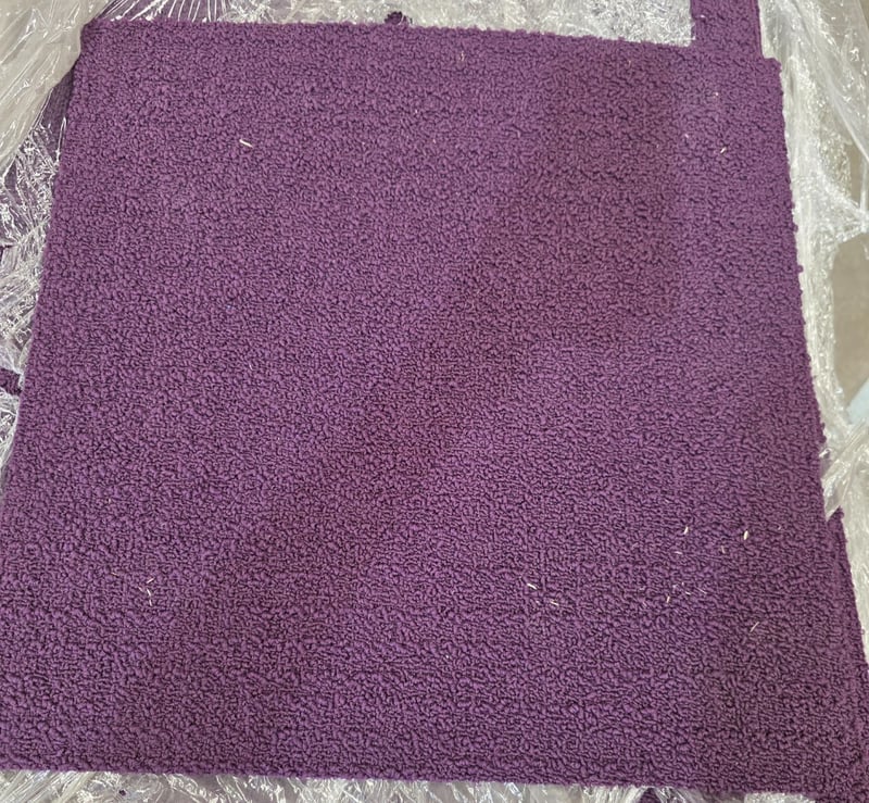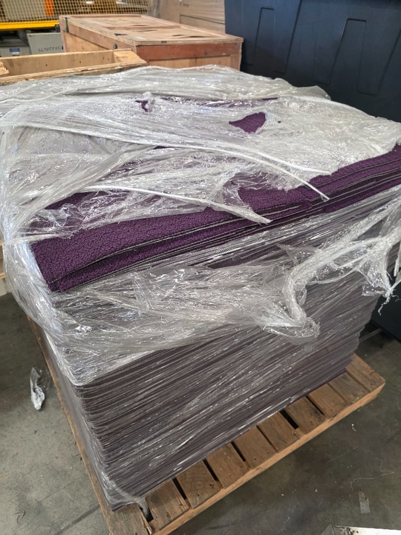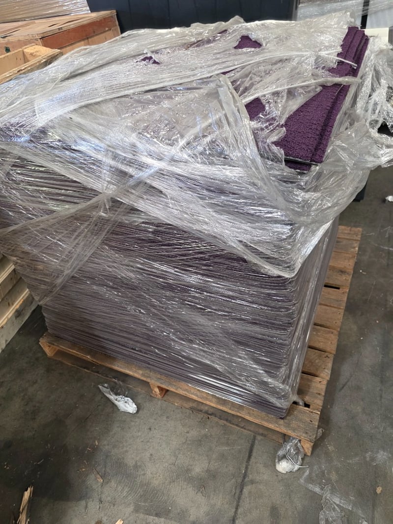 Bulk lot of commercial-grade carpet tiles in deep plum/burgundy colourway.