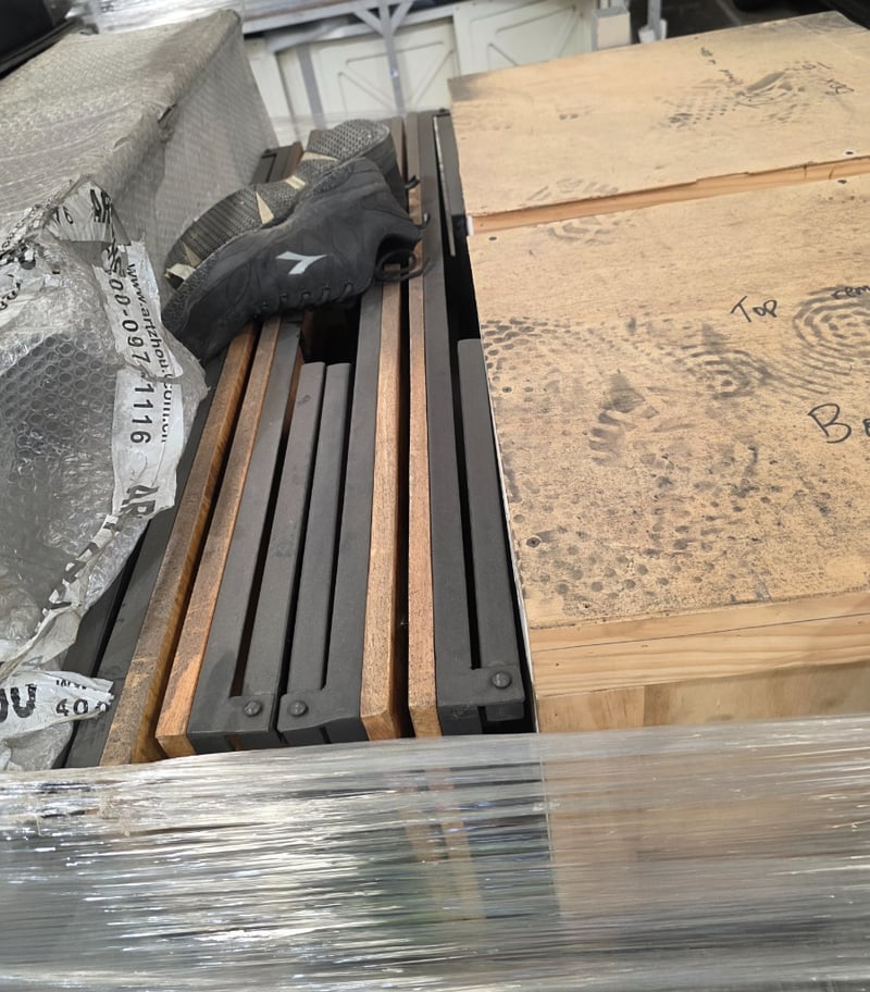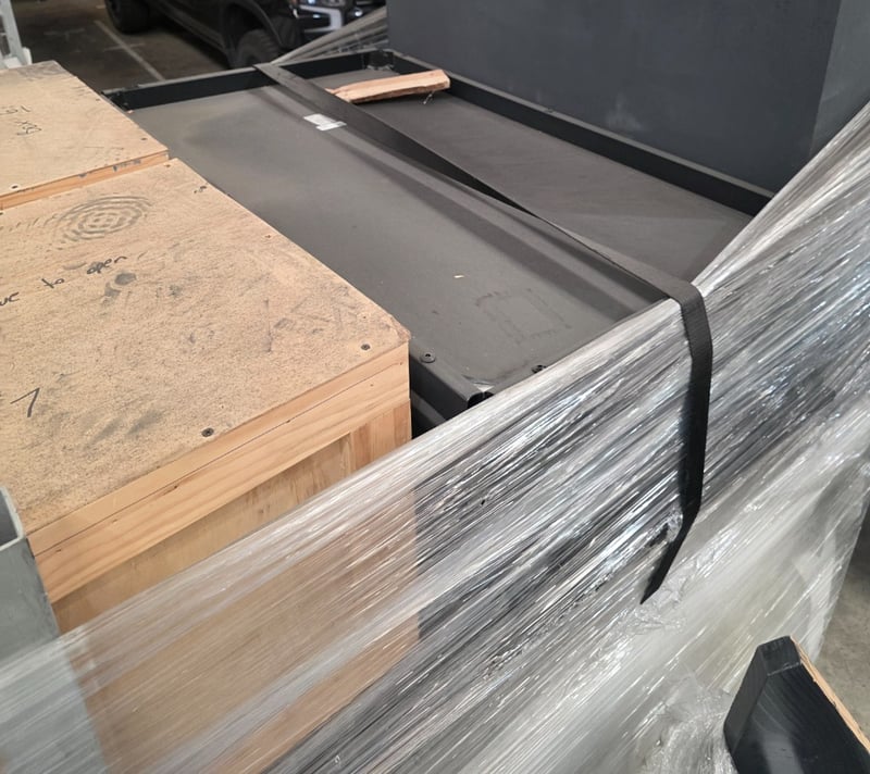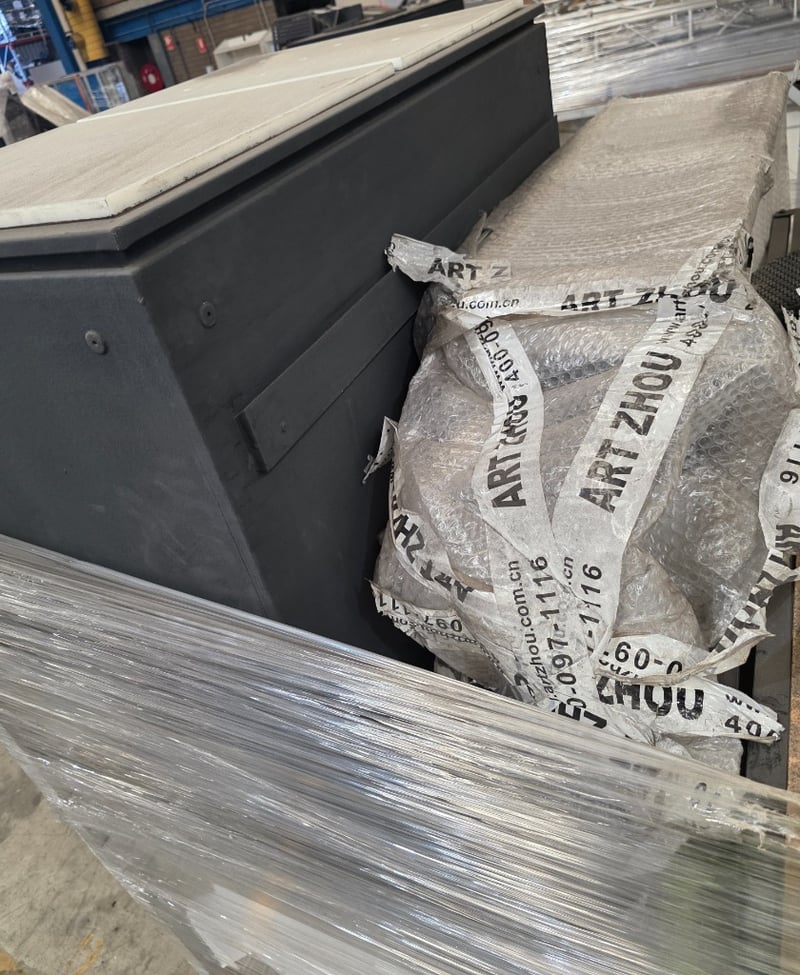 Industrial aluminium mobile storage unit containing wooden boxes, frames, stage materials, building supplies and more.