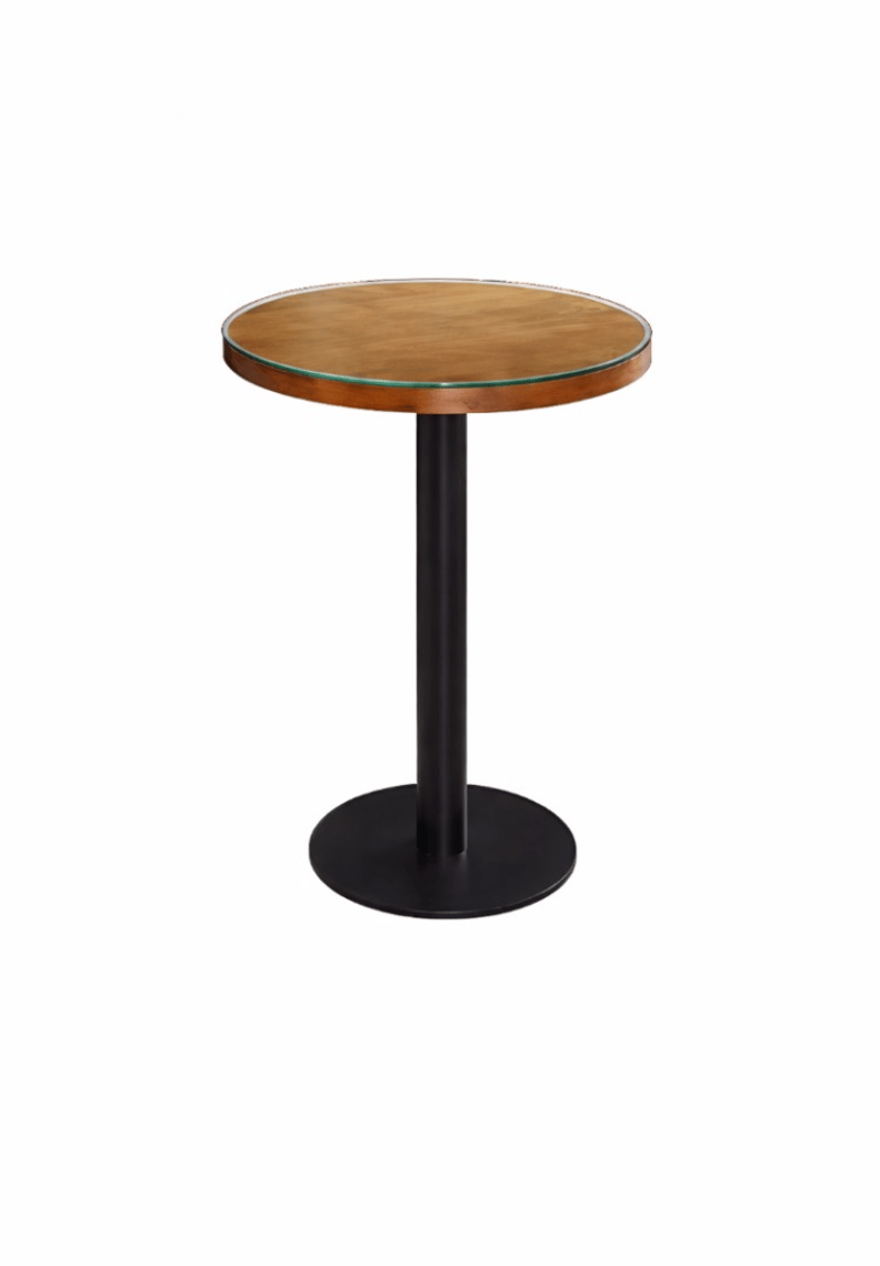 Round Cafe Table, Timber Style Table Top with a Glass Overlay and Iron Base.