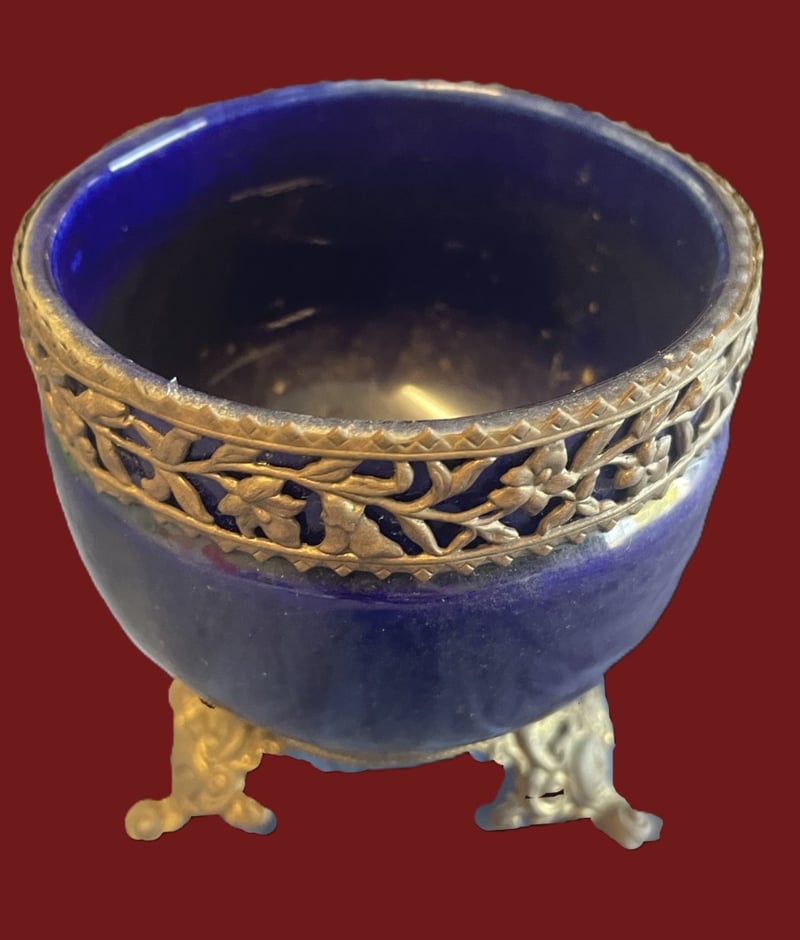 GOLD FRETWORK BLUE GLASS BOWLItem Size: Height: 9cm, Width: 9cm, Depth: 0.5cmCondition: Good - Refer To Images587946+105