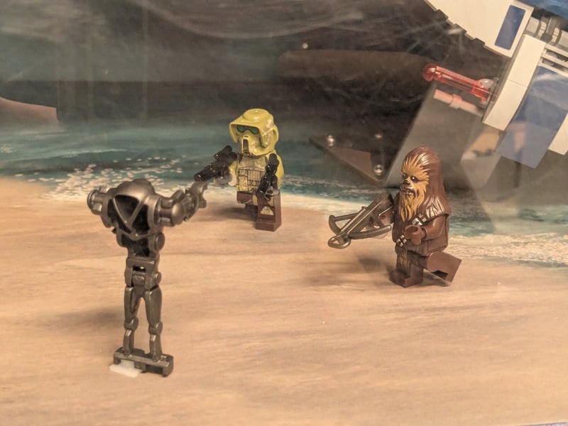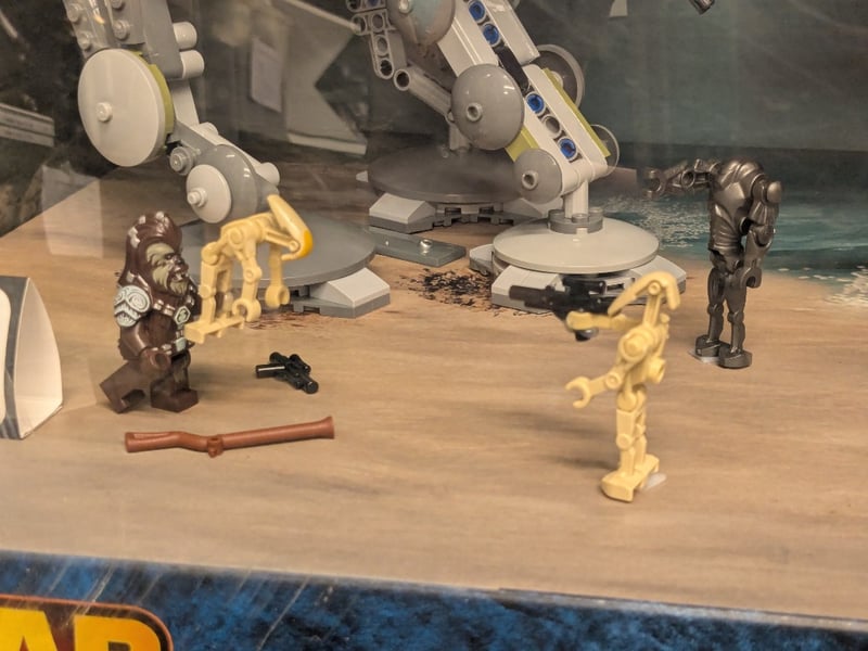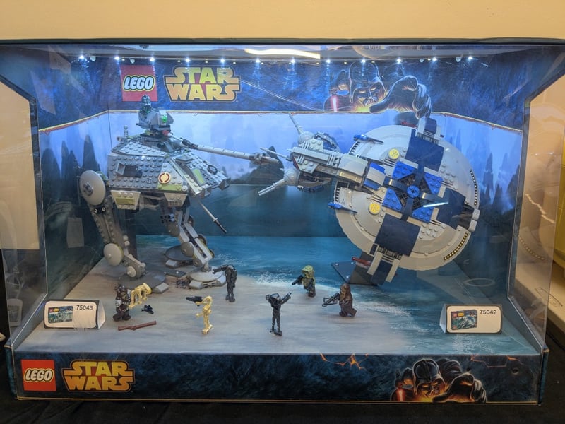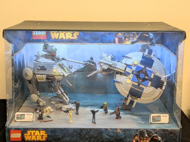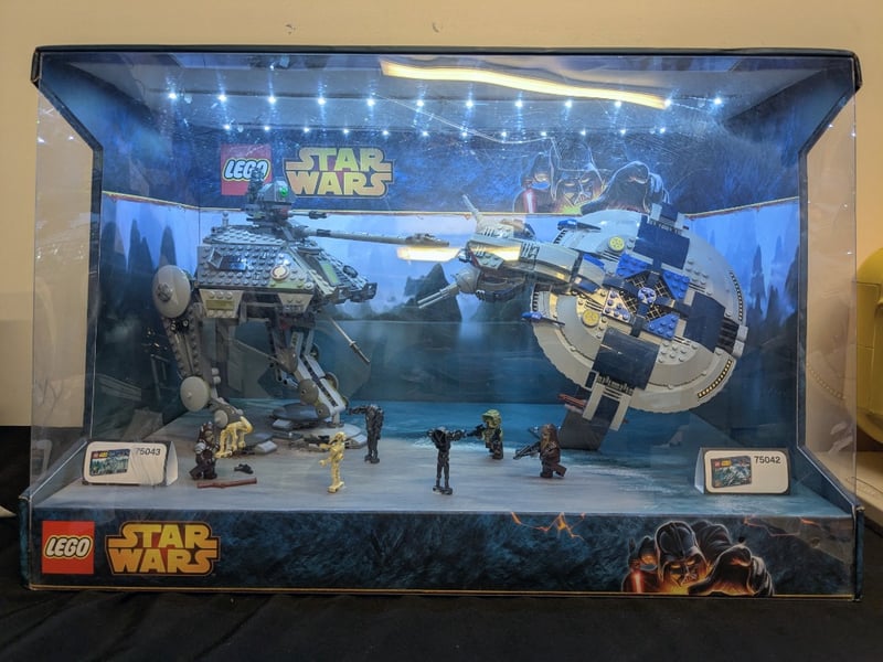 LEGO STAR WARS MOTION SENSORED DISPLAY SET 75042 DROID GUNSHIP & 75043 AT-AP WALKER COLLECTOR'S SHOWCASE Item Size: Height: 59cm, Width: 39cm, Depth: 38cm Vintage Lego Star Wars Dual-Set Display Featuring The Iconic Droid Gunship (75042) And At-Ap Walker (75043) In Original Retail Packaging Presentation. Complete With Minifigures Including Clone Trooper, Chewbacca, And Battle Droid Variants. Includes Detailed Spacecraft Models With Articulated Components, Authentic Printed Instruction Cards, And Original Box Artwork. Professionally Curated Exhibition-Quality Display With Illuminated Backdrop Depicting Geonosis Battle Scene. All Structural Elements Condition: Good - Refer To Images 584553+2